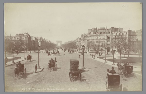 Curator: This gelatin silver print, titled "Gezicht op de Champs-Élysées met de Arc de Triomphe," by Edouard Hautecoer, presents a vista of Paris taken sometime between 1890 and 1898. Editor: The first thing that strikes me is the pervasive quietude despite the depiction of a major thoroughfare. The sepia tones imbue the scene with a gentle sense of nostalgia, and even with the carriages and figures present, the image feels strangely still. Curator: Yes, that muted quality speaks volumes about the societal position of photography at the time. As a burgeoning medium, photography was actively crafting its visual language within and against established modes of painting and drawing, to construct a new public memory. Consider how it represents the ongoing reconfiguration of Paris through urban planning at the time. Editor: Absolutely. This photo captures not just the architecture, but also the social dynamics being reshaped alongside the physical city. The presence and types of the carriages, the attire of the figures, the very framing of the Arc de Triomphe—they all point to power structures and societal norms. One notices an abundance of masculine subjects and labor. Where are the other citizens of Paris? Curator: I agree; reading the image critically means asking what the visual text encodes and excludes. It gives the photograph agency as a witness and maker of that social history. Even what appears to be objective or simple documentation speaks to power and agency in the gaze. We could use a Foucauldian lens to argue that the Arc, though physically centered, is symbolically mediated. Editor: This single image also represents a specific intersection of historical factors that affect artistic creation and distribution. The Champs-Élysées wasn't just a road; it was an emblem of French ambition, redesigned precisely for images like this to broadcast French identity to the world. It would be great to situate this image alongside photographs from other national contexts. Curator: Precisely. Comparing Hautecoer’s vision with photographs of similar urban spaces from London or New York, or even images of the rapid growth in colonized cities from this time, can deepen our understanding. How the photographer sees and positions himself to such grand axes of power makes all the difference in how audiences perceive, engage with, and interpret these spaces. Editor: And with photography democratizing image-making, the ability to critique this broadcasted image by citizen and labor reporters helped reveal social hierarchies operating underneath grand urban plans like Haussmann’s reconstruction. Food for thought.