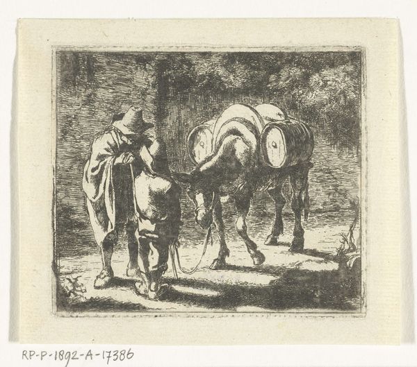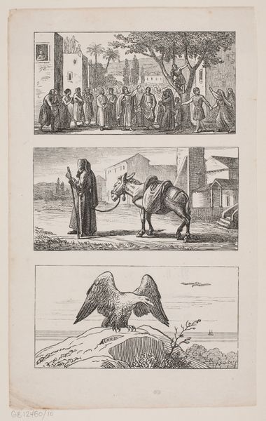 Curator: Looking at H.P. Hansen’s print from 1863, titled "Prøvetryk til Chr. Winthers A.B.C.," one finds an engraving rendered on paper, currently held at the SMK - Statens Museum for Kunst. Editor: My first impression? It feels like a stage set—melancholy meets quaint, almost cartoonish charm, and the tiny scratches bring forth an old world that's ever-so-slightly absurd! Curator: Absurd is interesting. If we consider this piece through the lens of 19th-century Danish nationalism, folk art production aimed at didactic lessons becomes complicated. A figure, perhaps a wandering scholar or even a religious mendicant, appears beside a donkey laden for travel, situated against simple buildings—perhaps symbolic representations tied to educating the populace about foundational myths or virtues tied to rural existence. What readings come forward, in terms of work or leisure? Editor: Maybe, yes! He does look weary to be honest! And you put him within a political environment which of course does create even more to think about in an image that is so subtle... it appears innocent on the face of it and that juxtaposition is fantastic. What about technique? Hansen captures these intricate details using a technique which gives a sort of roughness - not hyper-real if you know what I mean, but raw instead... Curator: Certainly, that rawness disrupts any romanticized depiction. Hansen uses etching to depict what appears a stark social narrative, grounding the print’s purpose as didactic. The setting is very simply described yet its texture, alongside our figure's ambiguous narrative and placement beside an ass laden for transport, suggests many readings which can become layered interpretations for social meaning. It does ask 'For whom are the lessons, the morals?' Who might read into such visual texts. Editor: Absolutely! It also poses bigger questions. How the artist felt towards his own labor! It really sparks an avalanche of reflection. To sum up I might argue, the piece feels both folksy and sophisticated simultaneously – this print leaves a delightfully bitter aftertaste that encourages to dig into art as visual culture a bit further. Curator: I concur. Hansen’s "Prøvetryk til Chr. Winthers A.B.C." invites us to unpack not just visual stories, but socio-political threads intertwined within 19th-century print culture.