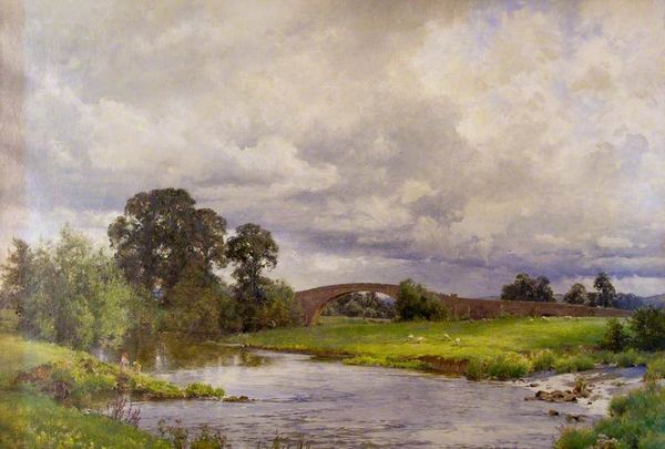Curator: We are looking at “Near Festiniog,” an oil-on-canvas landscape, by David Bates. Editor: Right away, it feels so… unsettled. The clouds are these huge, churning shapes, almost dominating the scene. It makes the landscape feel a bit vulnerable, doesn’t it? Curator: Indeed, the dramatic sky contrasts with the detailed brushwork in the foreground—the rocky stream, the hardy grasses. There's a clear attempt at realism. Editor: Definitely. I am struck by the use of muted earth tones; browns, grays, and greens creating a somewhat somber atmosphere. Are we meant to sense a premonition or just feel melancholic in observing this vista? Curator: It captures, I believe, a quintessential romantic ideal: nature's grandeur, but with a human element. Notice the figures near the center, almost camouflaged by the earth tones. Editor: I missed them at first. Those tiny human forms add a wonderful sense of scale. But I'm also curious, is the lack of clear focus, particularly in the mid-ground deliberate? Everything melts into soft hazes, a gradient to nowhere that blurs distinctions of meaning. Curator: Bates was working within the prevailing aesthetic of his time, which balanced representational accuracy with emotional resonance. Consider the interplay between light and shadow. See how Bates models a sort of drama in this tension of nature versus humanity? Editor: Good eye! The contrast directs our gaze from the darker earth up into this swirling celestial canvas that gives it such dynamism. You have made me appreciate its visual complexity now. I initially overlooked. Curator: It invites contemplation, doesn't it? Reflecting on man's place within nature. It's quite grounding in its own way. Editor: Precisely—despite my initial impression, it manages a certain understated peace in how we come to meet it halfway. I will take that.