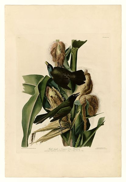Editor: This is Plate 177 from Audubon's *Birds of America*, showcasing white-crowned pigeons rendered in watercolor, drawing and printmaking. I’m struck by the almost photographic detail in the birds' plumage juxtaposed against the flatness of the surrounding flora. How do you approach interpreting this piece? Curator: Considering Audubon through a materialist lens, it’s essential to unpack the means of its production. These prints were part of a large-scale, industrialized project. Consider the paper, the pigments, the engravers' labor—these weren't simply artistic choices, but products of a complex system of resource extraction and skilled craftsmanship. What impact might the material origins have on our understanding? Editor: That’s a side of Audubon I hadn’t fully considered before. So, it's less about a romanticized view of nature and more about understanding the mechanisms that allowed the creation of these illustrations? Curator: Exactly. We need to think about the relationship between Audubon's project, resource consumption, and even the colonial project's impact on the very landscapes he documented. The artistry isn't divorced from the materiality; it's inextricably linked. Editor: The detail almost hides the impact of it all; all that’s needed to get there! It’s also interesting how this contrasts with, say, folk art, where the materials might be simpler, but more overtly connected to their source. Curator: Precisely. Even the ‘naive art’ elements you mentioned earlier highlights this tension, no? How does the presentation style affect our consumption of the subject matter? Is it meant to seem less complicated and contrived than it really is? Editor: This gives me a lot to think about in terms of art and its relation to not only artistic expression, but to labor. Curator: Indeed, and perhaps helps us look closer not only at *what* is depicted, but *how* it got to be depicted in the first place.