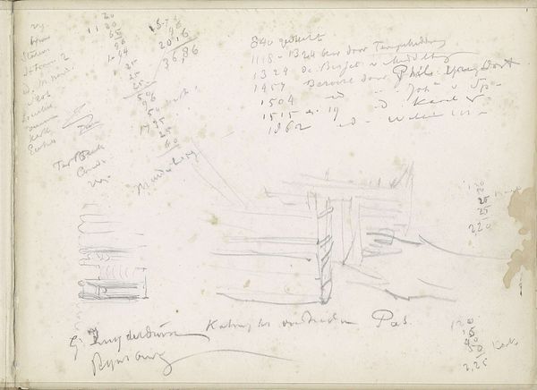 This drawing on paper, made by Isaac Gosschalk, presents a floor plan densely filled with lines and notations. The neutral background accentuates the linear framework defining each room. The sketch is almost an abstract composition. The spatial arrangement within the plan raises questions about structure and function. The lines, rendered with varying intensity, create a visual hierarchy, emphasizing certain areas and suggesting circulation routes. Numbers are scribbled across the image and denote measurements, offering quantitative insights that contrast with the qualitative nature of the sketch itself. The overlay of text and structural lines transforms the drawing into a complex semiotic system. Ultimately, the floor plan exists not just as a practical document, but as an intriguing work that plays with perception, representation, and the very idea of space itself.