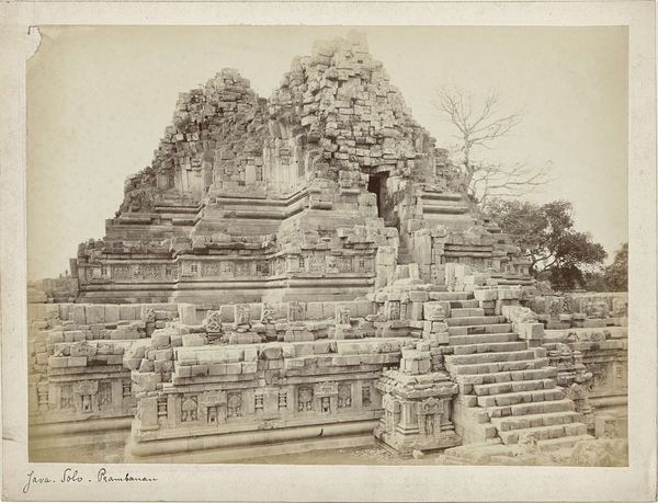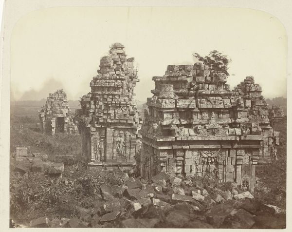 Editor: Here we have Kassian Céphas's "Poort van Taman Sari, Jogjakarta" from 1881, a photograph now held in the Rijksmuseum. It’s a wonderfully textured image of a gateway, almost swallowed by its ornamentation and the encroaching foliage. What draws your eye when you look at this photograph? Curator: The first thing that strikes me is the image as a product of labor and power. Consider Céphas: as a Javanese photographer in the Dutch East Indies, he was working within a colonial structure. Photography itself was a relatively new and expensive technology, requiring specialized equipment and chemical processes. This wasn't a simple snapshot; it involved deliberate choices about materials, technique, and presentation, shaping how the Dutch perceived Indonesian culture and architecture. Editor: That's a really interesting point. I hadn't thought about the colonial implications in that way. So, the very act of making this image, the materials involved, and who had access to them speak volumes? Curator: Exactly. Think about the materiality of the print: the paper, the chemicals, the lens grinding—each element represents resources extracted, processed, and distributed according to colonial power dynamics. Céphas's position as a local photographer also complicates the traditional Western gaze often associated with these types of images. How does the architecture fit into the broader history of material production in Java at the time? Editor: I suppose the craftsmanship evident in the gate’s carvings, which seem to be crumbling under time and vegetation, is a contrast with the controlled medium of photography. The gateway is Javanese handcraft but viewed through a western industrial lens. Curator: Precisely. By juxtaposing the organic with the inorganic, nature versus human-made, the image invites a deeper investigation of resource allocation, exploitation of labour, and colonial administration of materials. Editor: I hadn’t considered it in such a multi-layered, materially conscious way. I'm starting to see this photograph as far more complex. Curator: Right? The image becomes an entry point to examine power relations beyond aesthetics alone, thinking about the photograph as a commodity, not only a representation.