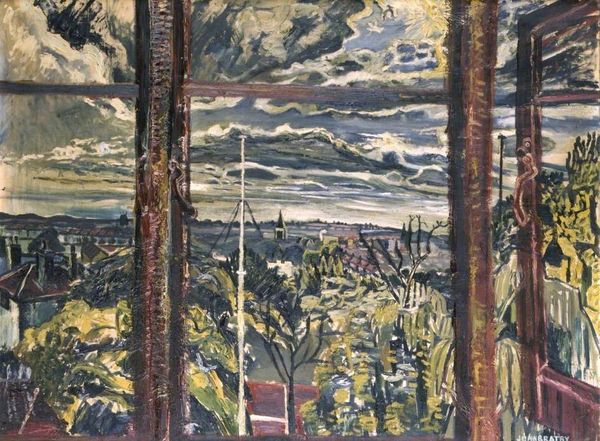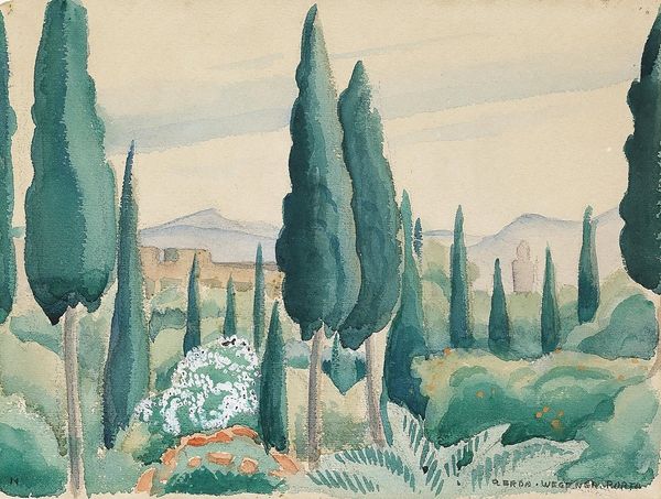 Curator: Well, doesn't this just feel like a dream bathed in soft pastels? It’s almost weightless. Editor: You’ve got an eye for atmosphere! We’re looking at Konstantinos Parthenis' "Music," a watercolor from 1920, painted during his Neo-Impressionist phase. Curator: "Music" is a fitting title, actually. The figures, almost ethereal, appear to be dancing to a rhythm only they can hear. And those elongated cypress trees – they're like silent conductors, guiding the eye upwards. Editor: Parthenis, steeped in the Symbolist movement, aimed to convey spiritual harmony and elevate art beyond mere representation. Examining this through the lens of feminist art history, we can consider how the depiction of these female figures relates to concepts of feminine ideals prevalent during that time. Are they active agents within the landscape, or romanticized ideals? Curator: Good point! I feel like it could go both ways. They seem so immersed in their own world. The landscape feels very…Mediterranean. I want to say Greek. I see rolling hills. It is as if their movements shape the very landscape itself. Editor: Parthenis, a Greek painter, integrated light, color, and form, endeavoring to capture the essence of Greek spirituality and natural beauty. Think of it in conversation with Duncan Grant and other post-impressionists who embraced light to move away from strictly naturalistic portrayals. This interest makes it an investigation of both place and identity. What relationship does the national have with myth? Curator: Exactly! And isn’t it intriguing how the artist uses watercolor to evoke such a sense of timelessness? It has a lightness of touch but the themes are anything but, and as viewers it leaves you contemplating identity and national mythologies that’s more pressing today than maybe it ever was! Editor: Definitely a piece to ponder, urging us to look at not only what’s on the surface but beneath too! Curator: Art for art’s sake but with its political and social conscience bubbling gently beneath it? Lovely.