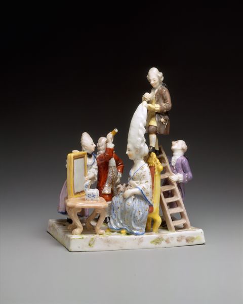 This sculptural group, made of porcelain at the Frankenthal Manufactory, presents a dramatic scene. At first glance, the eye is drawn to the vibrant colors and intricate detailing. A seated queen and standing king oversee the washing of a severed head, creating a tableau that is both unsettling and visually captivating. The composition is carefully arranged, with the figures forming a pyramidal shape that leads the eye from the base to the regal figures at the top. The use of bright colors like the queen's gold dress and the king's purple robe, is not merely decorative but also signifies the power dynamics at play. The base, adorned with gilded accents, elevates the scene, framing it as a spectacle of triumph and authority. This piece destabilizes the conventional understanding of porcelain as merely ornamental. Instead, it engages with themes of power, revenge, and justice. It challenges us to consider how materials and forms can communicate complex narratives.