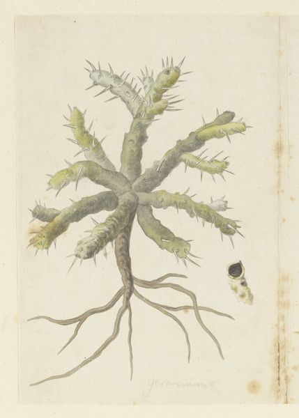 Editor: So, here we have Robert Jacob Gordon's "Pelargonium klinghardtense Knuth," possibly created between 1777 and 1786. It looks like watercolor on paper, and I’m struck by how scientific yet artistic it is. What do you see in this piece, in terms of its historical context? Curator: Well, beyond the botanical accuracy, consider Gordon’s role as a commander of the Dutch East India Company garrison. Botanical illustrations like these served colonial interests. How might this seemingly objective rendering reflect broader socio-political motivations? Editor: You mean, like, the Company documenting resources, possibly for exploitation? Curator: Precisely. And think about the power dynamics at play: a European officer documenting an indigenous plant, asserting a form of visual ownership. Did Gordon, a military figure, portray this plant neutrally, or did his social standing and role influence the image? Consider the impact of presenting flora from a "new" world to a European audience. Editor: I never thought of it that way; I just saw a pretty picture. But it is about knowledge and power, right? What the West chooses to show and study becomes important. Curator: Absolutely. It's about whose knowledge counts and who gets to define it. It pushes us to question seemingly objective depictions. This plant is observed through a very specific lens. And that has wider implications. Editor: I see, looking at it that way really opens up a lot of avenues for exploration. Thanks! Curator: Indeed. These objects exist not in a vacuum, but are produced by distinct figures in historical context with implications in representation. Thanks for asking me these fascinating questions!