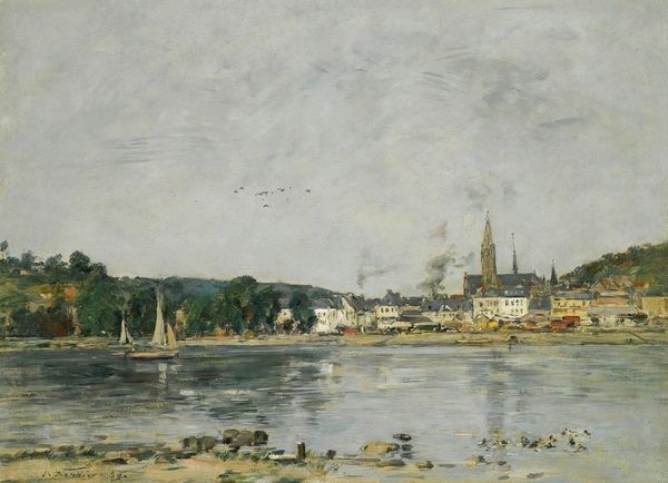 Editor: This is "The Inner Port of Trouville at Low Tide" by Eugène Boudin, and it looks like it was created using oil paint, maybe en plein air. The color palette feels very muted, and there's almost a haze over the whole scene. What do you see in this painting? Curator: I see a record of labor and industry, presented with an Impressionistic sensibility. The "low tide" of the title is crucial; it reveals the underbelly of a port, exposing the messy reality of maritime commerce. How do you think Boudin's choice of subject relates to the broader social changes happening in France at the time? Editor: Well, industrialization was changing the landscape quite a bit, but I mostly see pretty buildings and boats! Is it about something more than just the aesthetic appeal? Curator: Absolutely. Boudin's work, like many Impressionists, offers a glimpse into the everyday lives of the working class during a period of rapid modernization. He's capturing a moment of transition, and also who is caught up in that moment. It’s important to consider class and gender in these spaces. What do you notice about the figures depicted here? Editor: I see some people on the right, close to the water; it is hard to make out a lot of detail. Curator: Exactly. They appear to be women. And that detail makes it important to ask how Boudin represents these anonymous figures laboring in this industrialized space. Are they romanticized? Exploited? It's through this lens that we can unpack the painting's social commentary. Editor: That makes me think about how landscape painting, in general, is always about more than just pretty scenery. I didn’t realize that it could make a statement. Curator: It is also worthwhile considering the Impressionists relationship to painting *en plein air*, moving art outside of the studio, breaking down traditional hierarchies around painting, art production and the gaze of the art world. Editor: This has given me a lot to think about— thank you! Curator: It was my pleasure, and a good reminder for me that art exists in a constant state of exchange with those who view it!