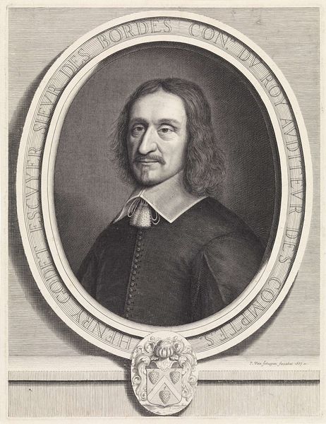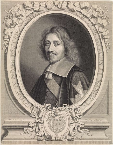 Editor: This is Jean Morin's portrait of Charles de Valois, Duc d'Angoulême. I'm struck by how formal and regal it feels, despite the relatively casual pose. What details jump out at you? Curator: The frame itself is fascinating! It's like a jewel box presenting its precious contents. It’s as if Morin is telling us that Charles de Valois is both a man and a symbol, carefully constructed for posterity. The armor juxtaposed with the soft fabric creates a compelling tension, don't you think? Editor: I didn't notice that contrast before. It definitely adds another layer to the piece. Thanks! Curator: My pleasure! Seeing art through different lenses always sharpens the view.
