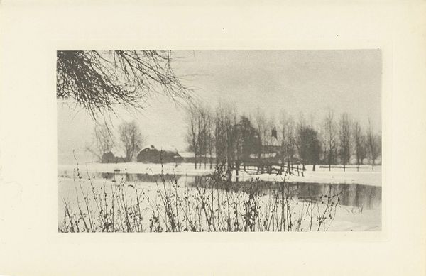 Curator: Standing before us is a gelatin silver print, "Sneeuwlandschap," or "Snow Landscape," by William Boyd Post, likely captured between 1900 and 1920. The image whispers of Impressionism, composed en plein air. Editor: It feels...bleak. Serene, but undeniably bleak. The monochrome palette heightens that sense of quiet desolation. Curator: Absolutely. This work emerges from a time when photography was fighting for recognition as art. Figures like Post strategically deployed techniques we see associated with painting. Consider the focus; it isn't razor sharp. Instead, Post softens the edges, giving a romantic quality that aligned with established notions of art and beauty. Editor: The blurring is deliberate. Look at the ghostly trees in the background – they almost resemble figures from folklore. They are archetypes rather than specific forms, a collective representation. They lend the image an aspect of enduring narrative and cultural weight. Winter as a moment for spiritual endurance or retreat. Curator: Right, photography, especially landscape photography, has long played a role in constructing national identity, especially in relation to land and wilderness. Early nature photographers promoted conservation efforts, showing pristine scenes but always revealing selective aesthetics that can be seen as an idealized, often nationalistic vision of "pure nature." The photographic gaze here becomes complex given the softened view. Is Post endorsing romantic idealization, or critiquing it by offering the "truth" that the view is softened by snow or obscured vision? Editor: That ambiguity feels central. The reeds in the foreground could symbolize resilience – life persisting even under harsh conditions. They remind viewers of nature's capacity to endure hardship while carrying with it both cultural memories of perseverance and psychological markers of hope during harshness. Curator: Yes, the winter season in landscape imagery can act as a powerful reminder of nature's cycles, touching upon mortality, survival and human relationship to climate and temporality. But even further the photograph as an object serves as evidence to the passage of time. Editor: In its subdued tonality, Post's landscape becomes less a picture and more a window into quietude; its cultural reverberations speak of introspection against a landscape that demands persistence. It reminds one how symbolic gestures persist and adapt throughout our histories. Curator: It certainly does give one much to consider, and I appreciate learning how his perspective can offer further reflections for our visitors to contemplate too.