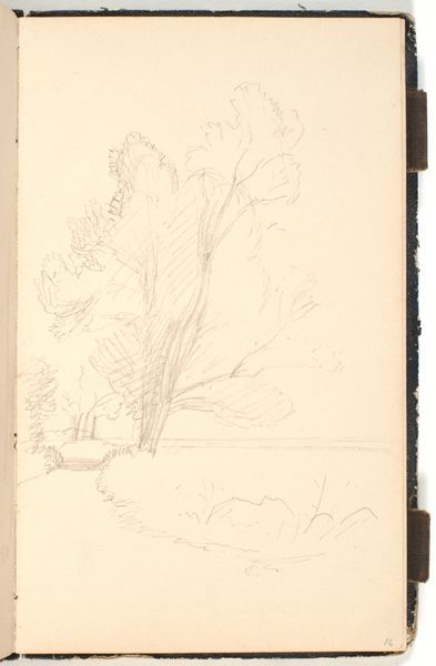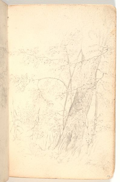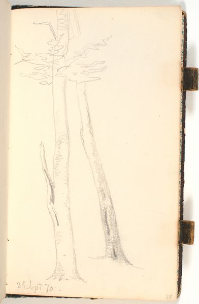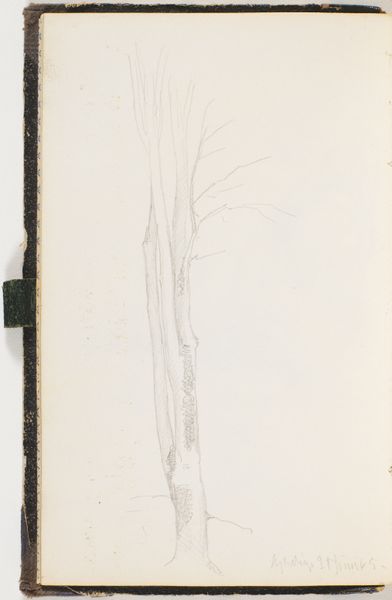 Editor: So, this is "Tre slanke træer," or "Three Slender Trees," a pencil drawing on paper by P.C. Skovgaard, created in 1870. It's a pretty simple sketch, and I'm immediately struck by how delicate the lines are. It feels almost like a whisper. What do you see in it? Curator: Whispers indeed. I love that. To me, this little sketch is like catching the artist in a moment of quiet contemplation. It's not a grand statement, but a private reflection. Skovgaard is mostly celebrated for his paintings but here you see a pure expression of form through the simple pencil line. Don’t you find that focus on shape almost abstract, despite being rooted in a realistic motif? Editor: Absolutely, now that you mention it. It’s not just about capturing the trees as they are, but about distilling their essence, right? I'm also seeing a contrast between the almost architectural precision of the trunks and the more free-flowing branches. Was he perhaps experimenting with different ways of representing nature? Curator: I suspect that you're on the right path, perhaps capturing a feeling about the landscape, rather than merely documenting it. Skovgaard was part of the Danish Golden Age movement, where artists sought to define a national identity through depictions of their local landscapes. Do you think a simple sketch such as this one helps inform that? Editor: That’s interesting. Maybe it's about finding the monumental in the mundane – seeing the essence of the Danish landscape in these unassuming trees. This sketch feels like a quiet, personal way of connecting with the national identity of his time. It's made me think about how even seemingly simple works can carry complex meanings. Curator: Exactly. It just shows us the beauty of Danish art. Always profound.