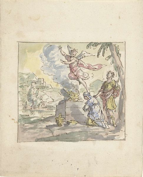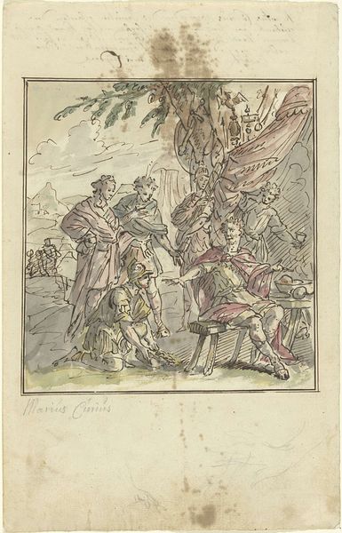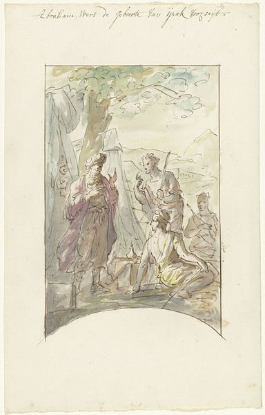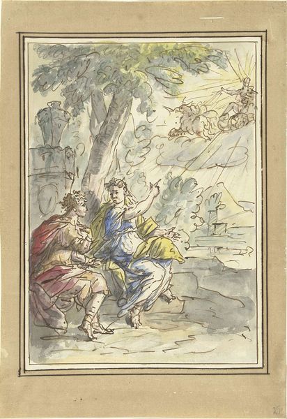 Editor: Here we have Elias van Nijmegen's drawing "De Tijd is de beste Leermeester," made sometime between 1677 and 1755. It's done with ink and watercolor, a lovely mix of detail and fluidity. I find it fascinating how he brings allegory to life with these figures and instruments, almost like a scene from a dream. How do you read this image? What stands out to you? Curator: It whispers of fleeting moments and the wisdom they carry, doesn’t it? The Baroque loved its allegories, its hidden lessons draped in sensual fabrics and dramatic poses. Look at Father Time there, holding his standard, not with a scythe, but presiding over a musical ensemble. Is Time teaching these figures, are they learning from time itself, or are they enacting time? I keep coming back to the water element in the foreground -- does this represent time’s constant flow? The fragility of watercolor mirrors the ephemeral nature of time, don't you think? Editor: I do now! The water element wasn’t something I picked up at first glance. Now the characters feel like they're floating, somehow both grounded in their tasks and unbound. It also made me realize that despite the title focusing on Time as a teacher, music and the ensemble are such a big component of the drawing. Are they related somehow, perhaps the fruits of Time? Curator: Exactly. And look at the statue looking down. Perhaps an embodiment of memory itself, suggesting music’s ability to preserve and pass down knowledge. Imagine if this was an operatic staging, with Time as conductor, wisdom carried on the winds of violins and lutes... Baroque, at its heart, is theatrical like that! This tiny sheet becomes an epic. Editor: This reframing has enriched my perspective so much. Thank you. I initially took the title at face value, now it's clearly about seeing and feeling all those interwoven layers of meaning, echoing far beyond a straightforward representation of Time as master. Curator: That is, I hope, the enchantment of Van Nijmegen’s watercolours, which hopefully will enrich yours.