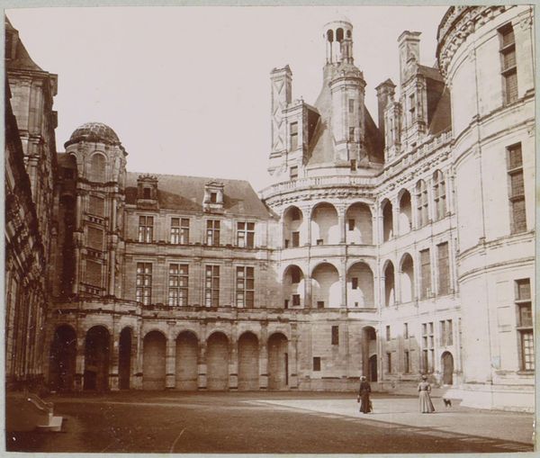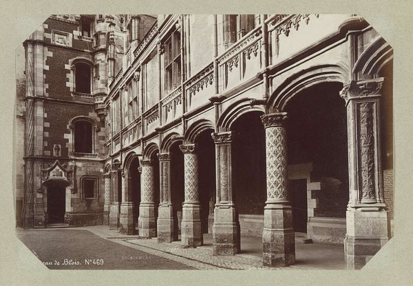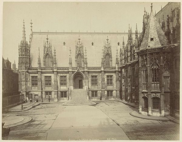 Editor: This gelatin-silver print, titled "École des Beaux-Arts te Parijs" by Charles Marville, dating from 1850-1851, presents a view of a courtyard in Paris. The monochrome tones emphasize the stone texture and architectural details, and I'm struck by how it captures the rigid, academic feel of the building. What’s your take on this piece? Curator: I see a fascinating intersection of materiality and power. Consider the labour involved in the construction of this École, from quarrying the stone to the intricate carvings. Each stage represents a hierarchy, where skilled artisans are enacting the vision of the bourgeoisie, shaping the very foundation of artistic training in the Western world. Editor: So, you’re saying the image isn’t just a record but a document of socio-economic stratification? Curator: Precisely. Marville’s choice of photography, a relatively new and reproducible medium at the time, further democratizes, while simultaneously somewhat alienating the meticulous craftsmanship traditionally celebrated in ‘high art.’ The building is imposing and made from valuable materials which required specialized labor. Where did these materials come from, and at whose expense was it built? Editor: That makes me think about how the Beaux-Arts style, meant to embody classicism, paradoxically becomes a symbol of 19th-century industrial progress. Curator: Exactly. The camera doesn’t lie, as they say, so how complicit is Marville himself in constructing and disseminating a very controlled image? Editor: It really reshapes my initial reading. I was so focused on the architectural beauty but missed the power dynamics etched into every stone. Curator: Indeed, seeing beyond the surface is crucial, whether we speak of architecture, sculpture, or a silver gelatin print. Every element implies cultural power at work. Editor: Thanks. I'll definitely be thinking more about material culture and the social contexts embedded in what I see going forward.