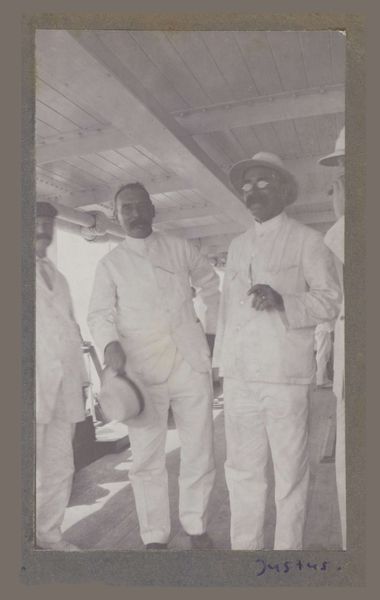Curator: So here we have Alfred Stieglitz's "Hodge Kirnon" from 1917, rendered in gelatin silver. Editor: A direct and thoughtful portrait. The monochrome palette and diffused light give it such a sense of quiet dignity. Curator: It's from Stieglitz’s modernist phase but retains the soft focus aesthetic of Pictorialism, creating a sense of intimate observation rather than detached objectivity. He was known for championing modern art. Editor: He’s holding what appears to be sheet music. Is that intentional? He seems framed by the light behind him as if about to step into a brighter, creative space. Sheet music…the possibility of music itself. Curator: Exactly! Kirnon was a waiter at the artists' salon, "291," and an aspiring musician. I think the hat and the sheet music denote some sophistication, some personal sense of style. Editor: I see cultural markers here as well, almost a foreshadowing of the Harlem Renaissance, wouldn't you agree? Curator: Absolutely. I'd say Stieglitz captured Kirnon’s quiet resolve and dignity. Editor: The photograph's tones…they’re sepia, and very soothing; so very distant to us now in time and style. It’s also fascinating to consider that Stieglitz—who promoted European Modernism—chose to depict this individual so deliberately, creating an indelible artistic memory of a man otherwise lost to history. It asks us to look—and remember—so much. Curator: I couldn’t agree more. What was otherwise a mere slice of life now transcends time, due to this beautifully framed composition. Editor: To look upon his expression is to reflect on resilience. There's a deep narrative locked within him. Curator: He seems about to speak, to engage.