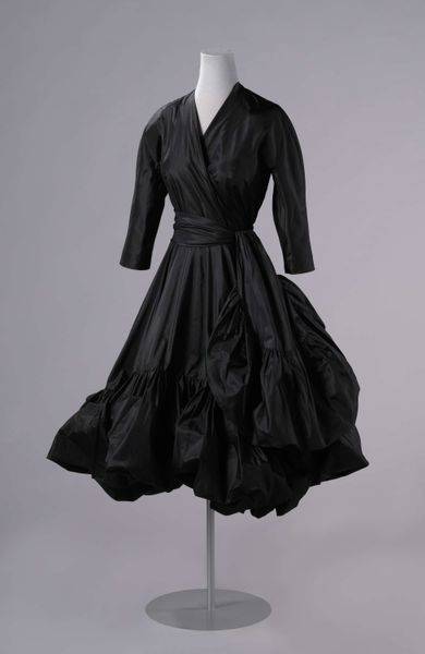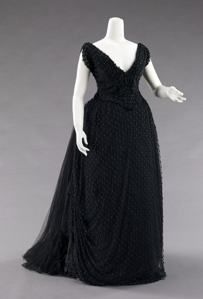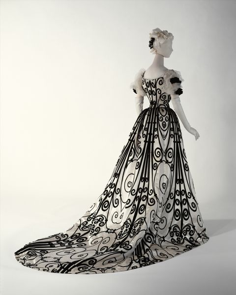 This evening dress, crafted by the House of Worth, presents a fascinating study in the persistence of symbols across time. Dominating the design are vegetal motifs, swirling and unfurling in dark velvet against a sleek background. These patterns, echoes of acanthus leaves and palmettes, trace their lineage back to ancient Greece and Egypt. Motifs that once adorned temples and palaces now grace the silhouette of modern elegance. Consider the palmette: initially a stylized date palm, representing life and fertility. Over centuries, it evolved, appearing in countless guises, from the lotus blossoms in ancient Egyptian art to the fleur-de-lis of French royalty. Such symbols engage us on a profound, subconscious level. They carry within them the weight of history, evoking a sense of continuity. The very act of wearing such a garment becomes a participation in a grand, ongoing narrative. These symbols are not static; they shift and adapt, constantly absorbing new meanings. They are a testament to the cyclical nature of history, where the past continually resurfaces, transformed yet undeniably present.