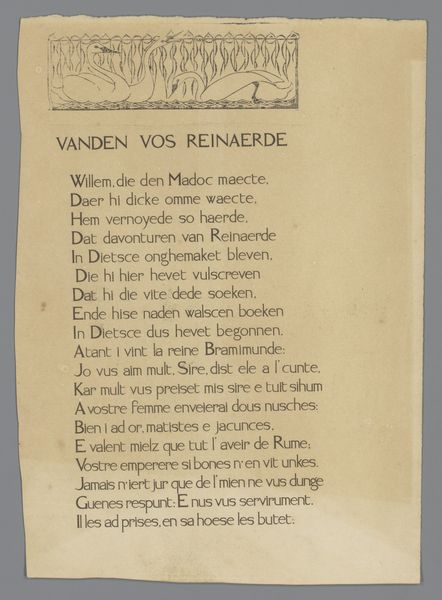This is a test print of twelve lines from "Van den vos Reynaerde" (Reynard the Fox), created by an anonymous artist using the Klei-type. The print offers a glimpse into the world of medieval literature, a time when stories often served as allegories for social and political dynamics. The tale of Reynard the Fox, a cunning trickster, resonates deeply with themes of power, deception, and survival. Set against the backdrop of a hierarchical animal kingdom, Reynard's escapades provide a biting commentary on human behavior, revealing how those in positions of authority can be easily manipulated. The use of the Klei-type, a typeface characterized by its simplicity and legibility, speaks to the desire for accessibility and widespread dissemination of knowledge. In a society where literacy was limited, the printing press became a powerful tool for democratizing access to stories and ideas. Consider the emotional undercurrents of the text: the tension between justice and injustice, the allure of forbidden knowledge, and the enduring human fascination with stories of cunning and resilience. This print invites us to reflect on the timeless themes that continue to shape our understanding of ourselves and the world around us.