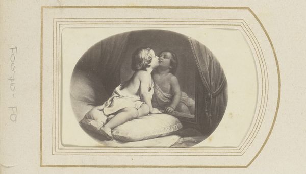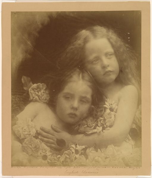 Curator: This gelatin-silver print, crafted between 1909 and 1910 by Henry Pauw van Wieldrecht, presents a captivating image of his daughters. Editor: It’s immediately striking how the sepia tones and soft focus give it such a dreamlike quality. The composition seems so carefully constructed. Curator: Indeed. Van Wieldrecht explicitly referenced Raphael’s Sistine Madonna with the poses of his daughters. We observe the allusion most clearly in their posture and wistful gazes, mirroring the famous putti at the painting’s base. Editor: The wings, while subtle, solidify the angelic reference, adding layers of symbolism. Innocence, perhaps, but also an idealized vision of childhood… elevated and otherworldly. It is quite successful at echoing Renaissance art, specifically in how the subjects are arranged within the rectangular format, almost like a frieze. Curator: The pictorialist style here is paramount, creating a softened reality through the manipulated focus and printing process. It lends an ethereal, almost allegorical feeling that moves it beyond simple portraiture. Observe the delicate gradation of light, particularly how it illuminates their faces, yet shrouds their bodies. Editor: It certainly elevates what might have been a simple family portrait to a symbolic exploration of idealized beauty and childhood purity. And the artist is successful at achieving this aim with very restrained tonality, the focus instead remaining with their carefully composed bodies. Is this staged spirituality perhaps? It feels both tender and self-aware, knowing. Curator: I find the careful staging intriguing and its resonance of genre painting that we do not expect within photography. It merges the sensibilities and historical connotations of art with technical execution. It moves towards abstraction, without completely sacrificing all direct and conventional elements of representation. Editor: It’s this duality of intentional artifice, balanced with the raw expressiveness of photography, that continues to engage me. It transforms something documentary into something profoundly evocative.