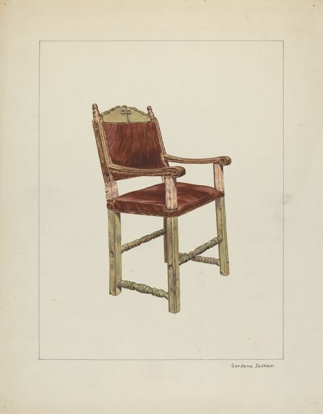 Florence Truelson rendered this drawing of a Sleigh Chair with watercolor and graphite. The muted palette and the subject matter create an intimate viewing experience. The essence of the artwork lies in its composition and form. Notice how Truelson uses an analytical approach to the object, breaking it down into essential geometric shapes and lines. The chair’s structure is simplified to reveal its underlying architecture. This abstraction invites us to look beyond the chair’s utilitarian purpose and consider it as an arrangement of forms in space. Truelson uses a consistent pale green color scheme to emphasize the chair’s formal qualities. The subtle variations in tone across the different surfaces highlight the interplay of light and shadow, adding depth and dimensionality to the composition. This calculated arrangement of form and color creates an intriguing dialogue between representation and abstraction, challenging our conventional perception of everyday objects.