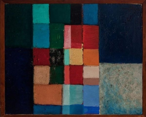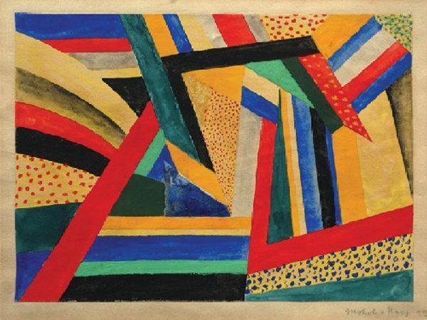 Curator: What grabs me first is how cheerfully chaotic it is! Like a city built by very optimistic toddlers with giant crayons. Editor: Well, speaking of, let's delve into that "cityscape." You're looking at Valerii Lamakh's "Composition #1," crafted in 1960 using acrylic on canvas. At its core, it's a dazzling demonstration of geometric abstraction, typical for the Modernist period. Curator: Ah, yes. It is geometry alright. It looks almost childlike with those confident, chunky lines and simple forms; I see so many squares and rectangles and curved lines. But still, it does seem meticulously thought through; there's intention behind that apparently unpolished simplicity. Editor: Precisely! It speaks to the very core of abstraction: forms and colors existing independently from a need to mimic reality. Lamakh isn't showing us a house, but the *idea* of a house—or maybe just a pure expression of balanced relationships and contrasts between the color palette. The intentional choice of those specific shades, which some might interpret as reminiscent of Ukrainian folk art? Curator: Yes, there’s this hidden echo, perhaps? Though that sort of reads back into the artist's history as an origin rather than something visibly within the artwork itself. But what does seem relevant to the historical perspective is how it pulls on folk traditions without completely giving up its claim to modernity. How it reconciles the old and the new to create something uniquely of its time! It's bold, bright, and yet...strangely soothing. Editor: A beautiful summary! The beauty of it, really, is its ability to invite those sorts of connections: personal, cultural, historical, or, you know, purely aesthetic... Curator: Yes, something for everyone indeed! Editor: That's where art truly lives!