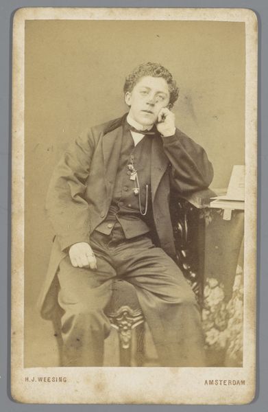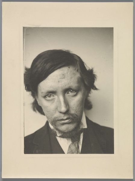 Editor: Here we have what appears to be a gelatin-silver print, with colored pencil, potentially from 1889. It's a double portrait called, rather straightforwardly, "Portraits of Willem Kloos and Isaac Israels" by Joseph Jessurun de Mesquita. There's something quite haunting about its faded tones. The eyes bore right through you. What strikes you when you look at it? Curator: Haunting is the right word! It's as if Mesquita captured more than just a likeness; he caught a fleeting shadow of their souls. Do you notice how the soft focus and subdued color create this aura of melancholic introspection? It speaks to the fin-de-siècle mood, a questioning of values and an obsession with the interior life. And isn't it intriguing how photography, then relatively new, became the perfect medium for portraying the 'real' but with an artistic license. It could document and, at the same time, invent. Editor: Invent, how so? Curator: Well, look at the subtle use of coloured pencil, for example. It delicately enhances the features, but also adds a layer of artistic interpretation. This wasn't simply a snapshot. It was a carefully constructed image, playing with the notions of identity, reality, and artistic license, making it more emotionally charged, more symbolic perhaps. One begins to question how truthful and authentic we are behind our controlled gazes, or what can the artist capture that remains unnoticed. Editor: So, it's both capturing a moment and crafting a narrative. I initially saw only sadness but now, I also find myself wondering what stories are hidden behind those somber faces. Curator: Precisely! It's in that tension between the seen and unseen, the known and unknown that this portrait gains its enduring power, and it invites us to create a narrative in our own mind, like a poem for the eye.