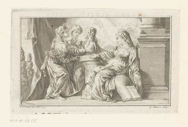 Theodor Matham created this engraving, "Mystical Marriage of Saint Catherine," likely in the mid-17th century. An engraving like this begins with a polished metal plate, usually copper, into which the design is carefully incised with a tool called a burin. Look closely, and you can see how the artist has modulated the lines to create shading and depth, a testament to Matham’s skill and the labor-intensive process of engraving, requiring meticulous craftsmanship. This print would have been made by inking the plate, wiping the surface clean, and then running it through a press, transferring the image to paper. Prints like this played a crucial role in disseminating images and ideas in early modern Europe, acting as a form of mass media before photography. By understanding the process of its creation, we recognize the engraving not just as a work of art, but as a product of a specific time, technology, and social context.