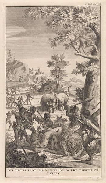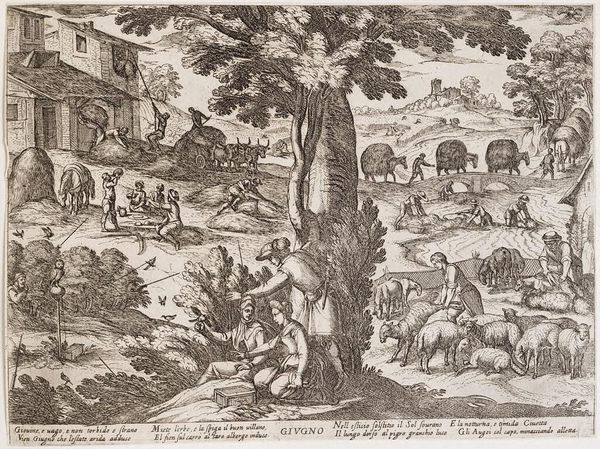 Curator: So, this engraving, “Allegorie op de hebzucht” or “Allegory of Avarice”, created by Remigius Hogenberg sometime between 1546 and 1588, is quite interesting. Editor: Yes, the sheer volume of detail is remarkable! The figures pulling the cart, the bulging sacks… it really emphasizes a feeling of intense labor. How would you interpret it? Curator: I see a very deliberate commentary on the systems of production and consumption within this period. Observe the landscape itself – notice the division between those who seem to profit, consuming food around a fire, and those burdened, literally weighed down, collecting material to add to the literal cart full of things to consume? The materials tell the story – from the trees which had to be felled to construct homes, the charcoal they use for fire. Everything is laid out for consumption. Editor: So, you are saying it's less about the individual failing of greed, but more about showing a whole cycle of resources to greed? Curator: Precisely! It critiques the whole societal apparatus. Even the medium of engraving, with its accessibility, comments on widespread distribution and thus, perhaps, accessibility of consumer goods even back then. Do you think the method of creating copies also reinforces this idea? Editor: That’s a clever way to put it – yes, printing makes it a commodity of sorts. Curator: It asks who benefits from these structures and who bears the literal weight of its process. This isn't just about moral failing, but the social machine perpetuating this uneven labor and value distribution. Editor: I never would have looked at an engraving this way before. Curator: Now you might begin seeing those material conditions represented in any type of image from today and yesterday. The world isn’t just a product to sell!