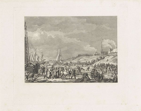 Curator: Ah, "Aankomst van de prins van Oranje te Scheveningen, 1813", an engraving by Cornelis Bogerts. The crisp lines, the almost photographic detail... it's striking for its precision, don’t you think? Editor: I do, but it also strikes me as rather…formal. Look at all those tiny people, stiffly arranged on the beach. It feels more like a meticulously staged tableau than a real, spontaneous moment of jubilation. Curator: Well, it does depict a very specific moment: the arrival of Prince William I on Scheveningen beach in November 1813, marking the end of French rule. Contextually, we have to remember this was meant to inspire feelings of national unity. Editor: Right, and engravings like this served as propaganda, disseminating that image of a powerful, legitimate leader widely, which raises questions about who gets to be visible and whose stories are told, and from what perspective. Curator: Yes, these images help in consolidating that political narrative through neoclassicist techniques. The artist seems concerned with conveying a sense of order and purpose. Yet there is a romantic undercurrent, it attempts to capture that emotion as well. Editor: The landscape, in particular, the beach meeting the turbulent sea seems to capture something grander than human politics. There are some dark aspects to it, the artist perhaps did not intend for the image to be perfect. It also reminds me about movements against neocolonialism and how the locals may have perceived it at the time, with feelings other than joy. Curator: I get that. It’s a staged event but there’s an interesting, complex energy at play. What seemed joyous perhaps concealed deeper sociopolitical turmoil and undercurrents, no doubt. Editor: Precisely. Which ultimately challenges the simplicity of historical grand narratives and prompts a critical reevaluation, no? Curator: Indeed! It allows a closer analysis of the values it represents.