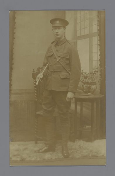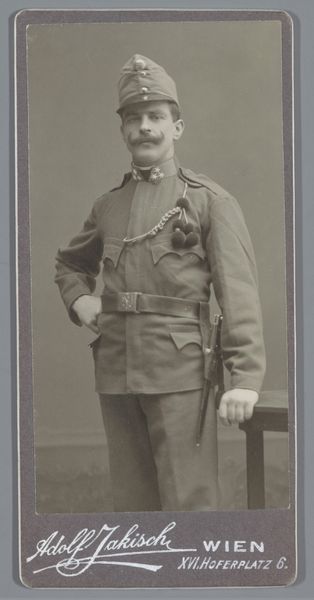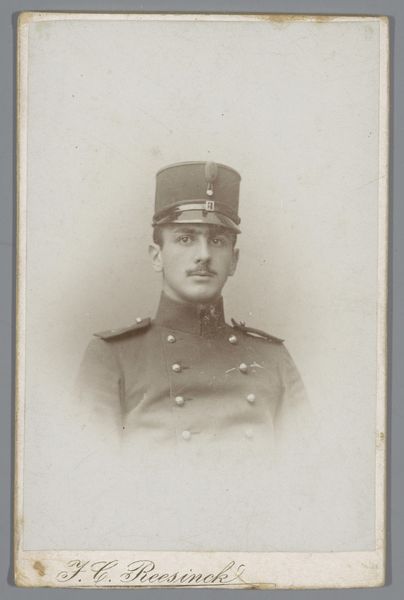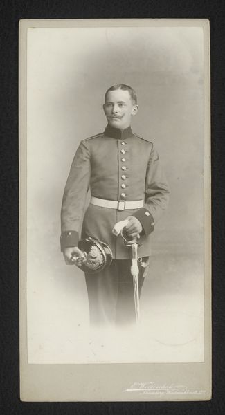 Editor: This is an undated portrait from between 1903 and 1914, titled "Portret van een onbekende man in uniform" by Theodor Liebert. It’s a monochrome photograph. I’m immediately struck by how stiff and formal he looks, yet he appears quite young. What can you tell me about the social context that produced this image? Curator: Well, portraits like this, especially those of men in uniform, gained immense popularity during this period, largely fueled by advancements in photography and its accessibility. Think about it: prior to this, portraiture was mainly for the elite, right? This image participates in the democratization of portraiture while simultaneously serving specific socio-political ends. Editor: Socio-political ends? What do you mean? Curator: Images like this served to normalize and celebrate military service, contributing to a culture of patriotism, and to visually disseminate imperial authority in the early twentieth century. The subject's rigid posture and formal attire reflect societal expectations surrounding military service and masculinity. Consider the broader cultural climate – the rise of nationalism and militarism in Europe, just before World War I. It becomes more apparent that photography was a tool in shaping public opinion and projecting national strength. What does the presence of studio insignia, “Th. Liebert” and “Verden, Brückstr.”, suggest to you? Editor: It definitely connects the portrait to a specific locale. Perhaps, the photographer enjoyed local recognition and a degree of influence, capturing and preserving a specific moment of history. Now I understand that a portrait like this can say something much bigger about an era. Curator: Precisely. Studying portraits of everyday people offers unique insights into power structures and everyday life. It is more than just historical photography: it is also social history.