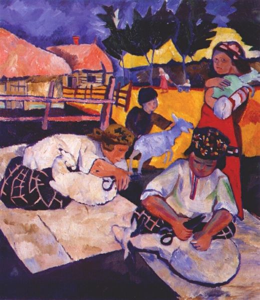 Curator: Welcome. We're looking at "Planting Potatoes," an oil painting completed in 1909 by Natalia Goncharova, a key figure in the Russian avant-garde movement. Editor: It’s strikingly powerful. The bold strokes and earthy tones give it an almost raw, elemental feel. The figures, though engaged in labor, possess an undeniable strength. There's nothing dainty or idealized about them. Curator: Indeed. Goncharova was interested in moving away from academic art traditions and embracing a more modern, direct approach to representing Russian peasant life. The impasto technique she employs, with the thick application of paint, contributes to the painting’s textured and somewhat primitivist aesthetic. Editor: And the bare feet firmly planted on the earth, the slightly abstracted forms… it all feels deliberate. It's less about a literal depiction and more about capturing the essence of labor, the connection to the land, and perhaps even the dignity in it. Are there broader socio-political implications here? Curator: Absolutely. Remember that this was a period of immense social and political upheaval in Russia, not long before the Revolution. There was a growing interest among artists in representing the lives and struggles of ordinary people, and to challenge the established artistic norms that catered to the elite. The very act of painting peasants as monumental figures was a political statement. Editor: It's a refreshing break from idealized depictions. The choice of these stark colours seems also a visual echo of their connection to the soil and how they interact with it to draw sustenance from it. The labour doesn’t appear romanticized at all; rather, it is imbued with weight. Curator: The art world, then, became a crucial site for negotiating these evolving notions of national identity, the role of the peasantry, and the direction Russian society should take. Goncharova really seized that chance. Editor: This painting stands as a testament to Goncharova’s artistic bravery. It’s powerful to see those aspects represented here in a monumental form, in which those bodies are not to be othered, or exoticized, but empowered instead. Curator: Well, hopefully our discussion offered fresh perspectives. Thank you for joining us in appreciating this seminal work from the Russian avant-garde. Editor: Indeed, there is an immediacy in viewing art that confronts societal expectations. Hopefully, this artwork's effect lasts beyond our momentary viewing.