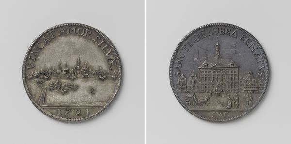 This silver medal, crafted by Martin Schmeltzing in 1697, commemorates the suppression of the undertakers' riots in Amsterdam. On one side, we see the figure of Justice bestowing a crown upon Amsterdam, a classical motif representing the restoration of order and civic virtue. Such imagery echoes the Roman concept of "virtus," where leaders were celebrated for their strength and moral rectitude. This motif of rewarding virtue appears throughout history, from ancient coins to Renaissance paintings, each time adapted to suit contemporary ideals and political contexts. Note how the act of bestowing a crown, a universal symbol of power and authority, touches something deep within our collective consciousness. The desire for order, the fear of chaos – these are primal forces engaging viewers on a subconscious level, transcending the specific event depicted. This medal thus becomes a powerful artifact, embodying the cyclical nature of history.