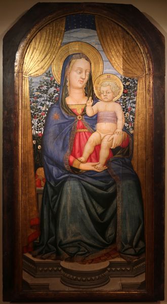 Editor: This artwork projects an immediate sense of ethereal calm. The blues and golds work wonderfully together, giving a celestial feeling to the entire scene. Curator: Indeed. Here we have "Madonna and Child Enthroned with Twelve Angels, and with the Blessing Christ," the middle panel of a triptych by Agnolo Gaddi, painted before 1387 using tempera on panel. The piece emphasizes a strong vertical orientation. Editor: I'm fascinated by the repetitive, almost manufactured quality of the angels' faces. It speaks volumes about workshop practices. Were many hands involved in creating such works? The scale of production must have influenced the final artifact significantly. Curator: That’s a very insightful observation. The angels flanking the Madonna operate more as visual elements, stylized supports to elevate the central figures, rather than distinct personalities. Look closely at how Gaddi uses line and symmetry to reinforce this hierarchy. The triangular structure, crowned by the blessing Christ, creates a rigorous geometric framework. Editor: And consider the intensive labor! Preparing the panel, grinding pigments, applying the gold leaf, then painting in tempera—each step demanded specialized skill. This wasn’t simply about artistic genius; it was about a collective mastery of materials and techniques. Curator: Precisely! The material choices themselves carry significance. The gold background symbolizes divine light and illuminates the entire composition with its reflective properties, adding to the flattening of space we see here. Editor: The raw materials likely came from diverse sources, passing through numerous hands. The lapis lazuli for that striking blue in Mary's cloak—its extraction, trade, and arrival in Gaddi's workshop constitute a hidden history. Curator: I agree, the material’s journey enriches our understanding. But return your gaze to the figures, and let's also appreciate the intricate interplay between line and color. Notice how Gaddi delineates form through carefully placed contours and the symbolic deployment of color. The azure blue, for example, evokes Mary’s divine role, contrasting the fleshy tones to emphasize her detachment from mortality. Editor: Thinking about the tangible effort poured into it helps me connect with this image on a deeper level. To ponder those actions… Curator: For me, dwelling on the structure and how this form generates content allows me to move past iconography and enter the artist’s universe.