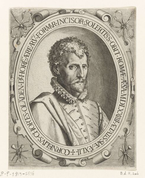 Curator: Let's turn our attention to this engraving, "Portret van Hubert Goltzius," created in 1574 by Melchior Lorck, currently residing here at the Rijksmuseum. What are your first impressions? Editor: Severe. The texture feels almost… etched into existence, not just on the surface but deeply felt. Look at the precision of the lines depicting his ruffled collar, the unforgiving gaze. This is craftsmanship bordering on industrial production – multiplying the sitter through reproducible labor. Curator: Lorck really captured Goltzius' gravitas. The meticulous detail transforms paper into something akin to character made manifest. I’m also drawn to the Northern Renaissance style—there’s an almost brutal honesty in the rendering. It feels incredibly human, though, not cold. Editor: Precisely! And what about the material, that physical rubbing of the plate? The ink becomes this dark mass. The man becomes, in a way, a product. It begs the question, which labor is celebrated more: Goltzius' own intellectual work, or Lorck's sheer reproductive toil? And how does making him available change the meaning of his persona and accomplishments? Curator: That's a wonderful angle! You know, the very act of creating this multiple for mass distribution adds a layer to his reputation and influence as an important historiographer and antiquarian of his day, in a way it makes his persona much more approachable. It immortalizes him but at the same time diminishes his uniqueness through labor that is reproducible. But, stepping away from that aspect, if only for a moment, I have to admit it stirs within me some pensive feelings thinking about aging. Editor: That reflection makes it much more of an accessible commentary to today's patrons. I'll keep that idea with me for sure! Curator: Me too! So much to appreciate, truly.