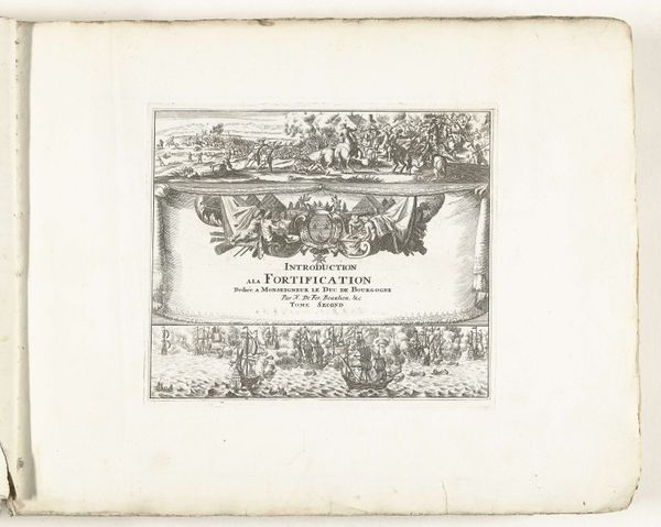 Editor: This is "Titelprent voor prentwerk: Les Forces de l'Europe, Asie, Afrique et Amerique (deel 4)" which translates to Title Print for print work: The Forces of Europe, Asia, Africa, and America (part 4), it’s a print made around 1702 by Jan van Vianen. The fine lines of the engraving and the bustling scene within the border really give it a sense of historical importance, even gravitas. What strikes you most when you look at this? Curator: What I find immediately compelling is the relationship between labor, power, and representation that this print embodies. Consider the immense work required to produce such a detailed engraving, and how that craft itself becomes a signifier of authority. Look at the depiction of military might, cannons, fortifications - and ask yourself, how does the medium reinforce the message of European dominance? Editor: That's a really interesting point, thinking about how the *act* of creating the artwork contributes to the meaning. So the very process strengthens its message. It’s almost propaganda through craft? Curator: Exactly! The clean lines and precision of the engraving lend an air of authority and objectivity, masking the subjective biases inherent in portraying European power. Who is laboring? Where are the raw materials sourced from? How would an artisan, an enslaved worker, or an indigenous person, perceive and depict the making of such imagery? It forces us to recognize the intricate networks of material and social relations woven into even seemingly straightforward representations of power. Editor: That shifts the focus entirely, from just *what* is being shown to *how* and *why*. It's not just a scene; it's a product of specific labor and global power dynamics. Thanks, that’s really opened my eyes to the layers beyond the surface image. Curator: Indeed, considering the materiality and means of production reveals the complex networks of power embedded within seemingly simple images, compelling us to think more critically about the art we consume.