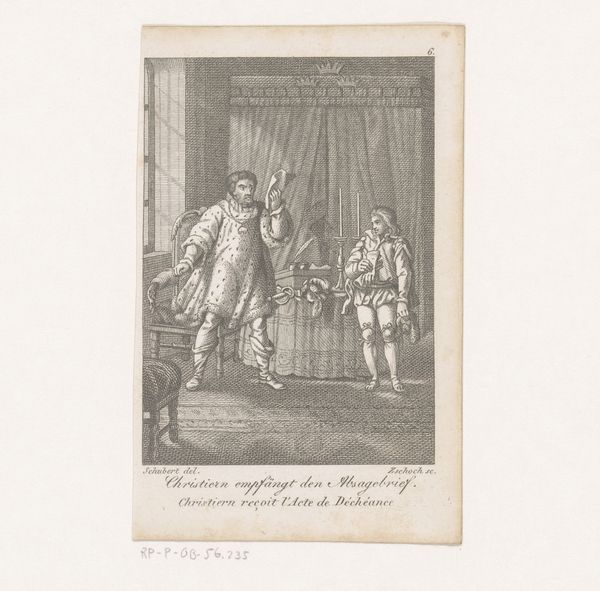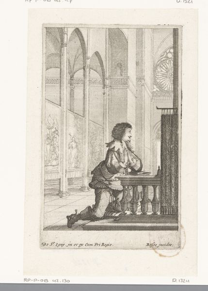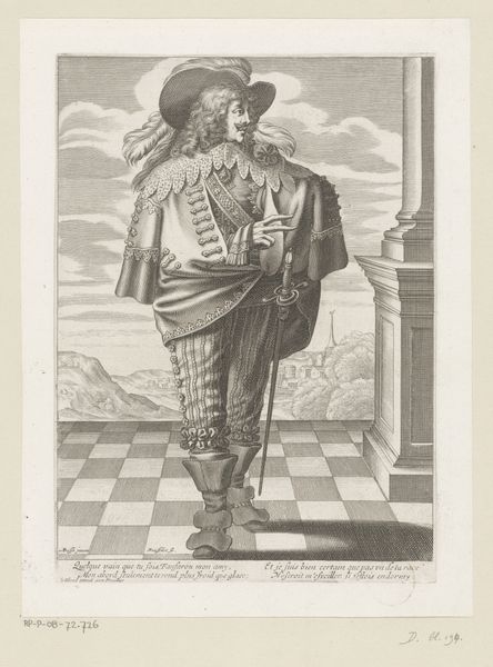 Editor: Here we have Abraham Bosse's "French Courtier Following the Edict of 1633," created in, well, 1633, using engraving. I'm immediately struck by how this piece seems to be poking fun at someone trying too hard to fit in. It's almost comical! What do you see in this image? Curator: It's a fascinating snapshot of social regulation through fashion. Consider the Edict of 1633: a real attempt by the French crown to curb excess in dress, particularly amongst the court. This print then becomes more than just a portrait, it is social commentary. Editor: Social commentary through an engraving? Curator: Exactly! Bosse isn't just depicting a fashionable man, he’s showing us the *performance* of adherence to rules imposed by the monarchy. How might the public have perceived this figure at the time? As fashionable or ridiculous? Editor: Probably a mix of both? He's clearly trying, but maybe trying too hard, thus amplifying the crown’s perceived authority or control over the upper classes? Curator: Precisely. Bosse's prints circulated widely, shaping perceptions and sparking dialogue about courtly life and royal power. Do you notice how carefully rendered his posture and clothes are? What is emphasized? Editor: It’s like he's advertising his…obedience, but perhaps inadvertently highlighting the artificiality of it all. The exaggerated bows at his knees make me think the dress and pose is not something he would actually do! Curator: And therein lies the social critique. Art becomes a mirror, reflecting societal norms, anxieties, and the ongoing power dynamics between the individual and institutions. Editor: That’s really insightful. I'm now thinking about the role of satire in shaping public opinion back then, not just beautiful portraiture. Curator: It changes our view, doesn't it? A print, like this one, can open a window into a past world – its struggles, its aspirations, and its exercise of soft and hard power.