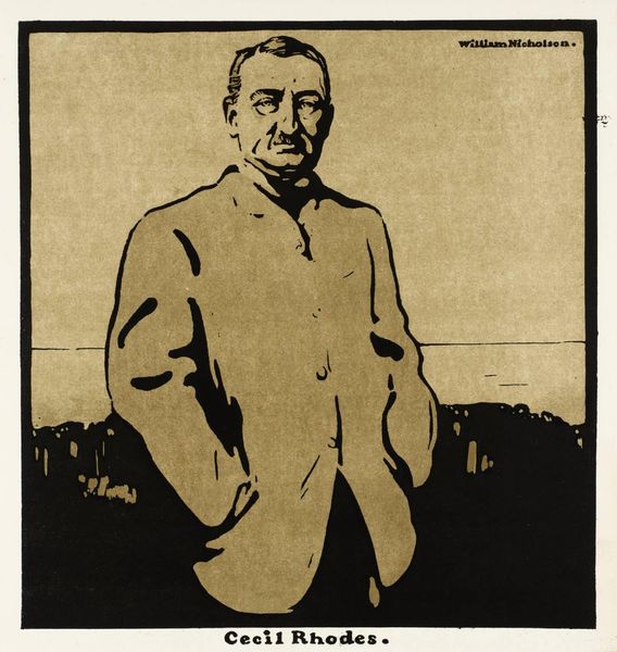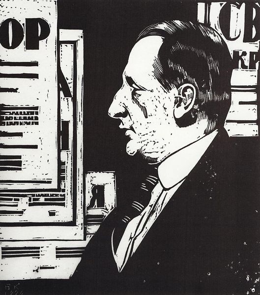 Editor: This is Boris Kustodiev’s 1926 woodcut, "Portrait of Soviet actor Nikolay Monakhov." I find the high contrast and graphic style so striking! What's your interpretation? Curator: Indeed! The severe black and white adds to its impact. For me, beyond just a likeness, Kustodiev captures the essence of the Soviet actor within a specific cultural milieu. Look at the curtain and vaguely neoclassical structure. Don’t they echo a theatrical set, hinting at Monakhov’s profession, while framing him as a cultural icon? Editor: That’s a fascinating point. The surroundings really do contribute to the narrative. The symbols next to "1926" looks like the cyrillic numerals "XXX", so "30", but do you think that detail is deliberate, some comment about the age of the sitter, maybe? Curator: Perhaps, or it might be that number indicated some event or stage production with which Monakhov was associated. But notice too the carefully etched background elements--they seem deliberately stylized, even a bit dreamlike. How does that affect your perception of Monakhov himself? Editor: I hadn’t considered the dreamlike aspect. It makes him less of a simple portrait and more like an archetype, representative of something larger than just one actor. Almost like a stage character he's perpetually embodying. Curator: Exactly! The artist uses Monakhov as a symbol for Soviet artistic achievement and projecting its vision, perhaps. The symbols work together. It’s a fascinating blend of the personal and the representational, a hallmark of powerful portraiture. Editor: I’m leaving with a much richer understanding of how images can carry cultural significance.