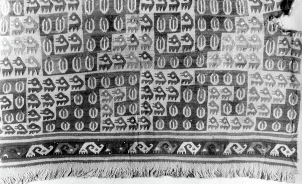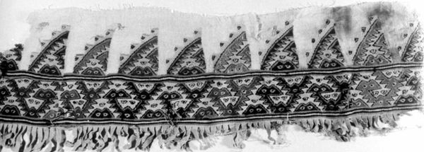 This band was made by the Chancay people of Peru, using cotton and feathers. It represents a sophisticated textile tradition, where the act of weaving is far more than just a practical craft. The tight, consistent weave shows careful work and considerable time investment. The cotton threads are dyed in contrasting tones to create geometric patterns, which are then embellished with applied feathers. These wouldn't have been easy materials to come by. Cotton production required cultivation and processing, and the feathers likely came from birds with symbolic value. The weaver has imbued the band with significance. This kind of weaving was not merely decorative. It was a labor-intensive process embedded in a specific cultural context. Textiles like this one played a vital role in Chancay society, signifying status, religious beliefs, and social identity. Understanding the making of this band allows us to appreciate the considerable skill, cultural meaning, and historical context woven into its very threads.