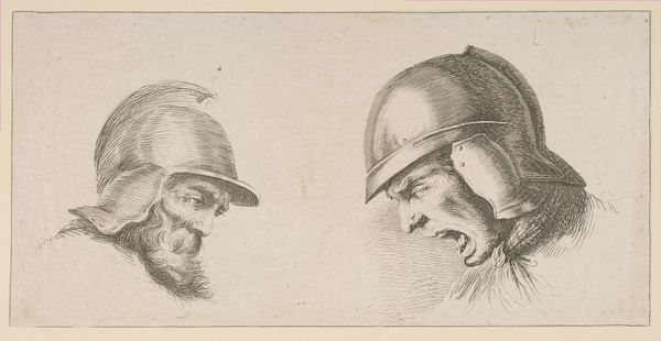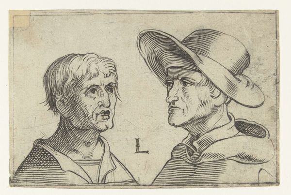 Editor: Here we have "Houte Klaes en Kommer-sloofs," an engraving dating from 1612 to 1652, attributed to Johannes or Lucas van Doetechum and currently held in the Rijksmuseum. The distinct expressions and carefully etched lines give the portraits an intense and slightly unsettling feeling. How would you interpret the dynamic between the composition and the expressions of the subjects? Curator: Focusing solely on the formal elements, note the use of ovals as framing devices. These repeated shapes create a sense of balance while simultaneously isolating the two figures, intensifying our focus on the texture of their faces. The Northern Renaissance is defined by this interplay between form and function. How the linear detail contributes to the psychological depth of the subjects becomes an important element, no? Editor: That's a keen observation. I hadn't considered the ovals in terms of their isolating effect. I was mostly captivated by the contrasts between the characters' countenances and garments. Would it be pushing it to argue that those contribute to its genre categorization? Curator: While we cannot deny the "genre-painting" theme, consider that any categorization of an artwork falls outside the artwork itself. But note that it hinges, ultimately, on contrasts: light versus shadow, the positioning of figures, the geometry of their bonnets, all contribute to this engraving’s dynamic formalism. Can you trace the directionality of the lines and how that affects your gaze? Editor: Now that you point it out, the linework certainly guides my eye throughout the portraits. I appreciate how that attention to form contributes to a deeper understanding. Curator: Indeed. Ultimately, our exchange reinforces the necessity to focus first on form, before arriving at interpretation. The artwork has communicated even when divorced from what is depicted.