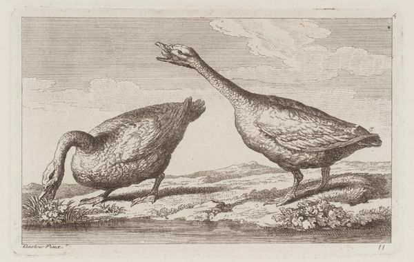 Editor: This print, simply titled "Ruffs" by Francis Barlow, shows a trio of birds in a marshy landscape. The level of detail is incredible. There is one bird looking at something above them, the other is bowing towards water. I find their plumage so interesting. What do you make of this piece? Curator: It's a delightful study, isn't it? I see echoes of Aesop's fables. The ruff, with its elaborate plumage, becomes a character, a symbol of vanity perhaps? Barlow had such a keen eye. The lines capture the birds' delicate legs so beautifully! Editor: Do you think there is symbolism behind the different poses of the birds? Curator: Potentially! It may be alluding to different aspects of behaviour. A reminder of the world around us? We can all see what we want. Editor: I never considered it could be read as a fable. Thanks!