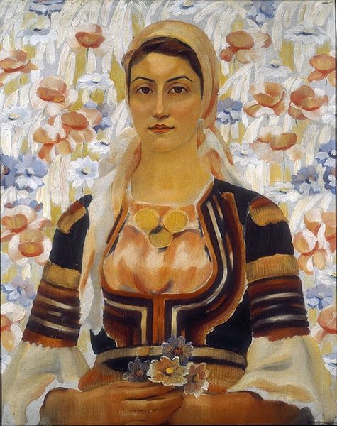 Vladimir Dimitrov painted this unknown sitter surrounded by flowers and fruit. Her hands are clasped, an ancient gesture of composure and humility. Notice the apples: round, ripe, and recurring in art history as symbols of temptation, knowledge, and mortality. We recall the Garden of Eden, where the apple led to humanity's fall from grace. Yet, the apple is also an emblem of immortality, found in classical myths where gods bestow apples for eternal youth. The motif of the clasped hands, a sign of piety or submission, appears across centuries, from ancient Roman sculptures to Renaissance portraits. It is a powerful expression of inner reflection and perhaps resignation. Dimitrov evokes this gesture, charging it with a blend of stillness and profound emotion. The symbols within resonate beyond their immediate context, speaking to our collective unconscious, their meanings shifting yet persistently echoing through time.