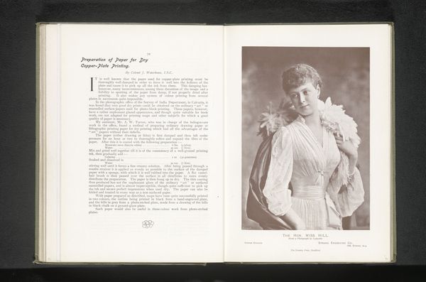 Curator: This photograph, titled "Child Study," comes to us from Meacham & Sabine. While the precise date remains elusive, we know it was taken before 1895, presenting a fascinating glimpse into the past. Editor: My initial impression is one of quietude. The soft, diffused light lends the scene a certain dreamlike quality. It’s quite formally posed, yet something about her expression suggests an intimate moment captured. Curator: It certainly invites that interpretation. The image is part of a larger volume, with the text positioned to the left page serving as a dialogue partner, setting the scene within discussions of photographic progress and pricing. The child, surrounded by such commentary, feels almost emblematic of a future made possible by photographic innovation. The lace, for instance, made easily reproducible. Editor: Visually, I'm drawn to the recurring circular motifs. The curls of her hair mirror the shape of the chair’s wicker seat, and the curves of her dress. Then the circular shapes that compose the chair's design. This creates a kind of visual echo, drawing the eye inward. I wonder if these details hold a more profound symbolic meaning—circles often represent wholeness and eternity. Curator: Absolutely, those details resonate within wider cultural attitudes towards childhood innocence and feminine virtue, reflecting the socio-political constructs of that time. The child sits confined by the chair. Her expression reflects the limitations imposed by those notions. It speaks volumes about how societal expectations can subtly confine and mold even the most vulnerable amongst us. Editor: So you’re reading it as a critique, rather than a celebration, of societal expectations? Curator: Both, perhaps? It is not enough to show the pretty child without also observing the systems framing her development. By presenting the photograph within its original book context, the child as “study” enters dialogue with questions of labour and technological innovation. This dialogue illuminates anxieties around the impact of new technologies and ways of seeing on our cultural imagination. Editor: It's amazing how one image can hold such multifaceted meanings, layered with social, historical and symbolic depth. Curator: Precisely. The beauty of art is that it lets us see and then, perhaps, revise what we thought we knew about ourselves.