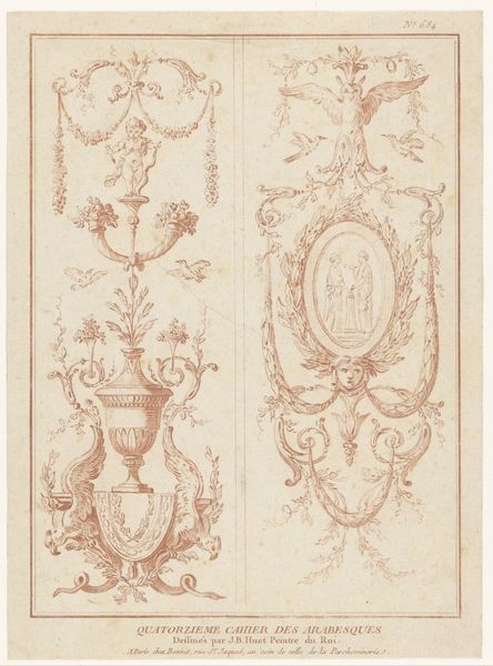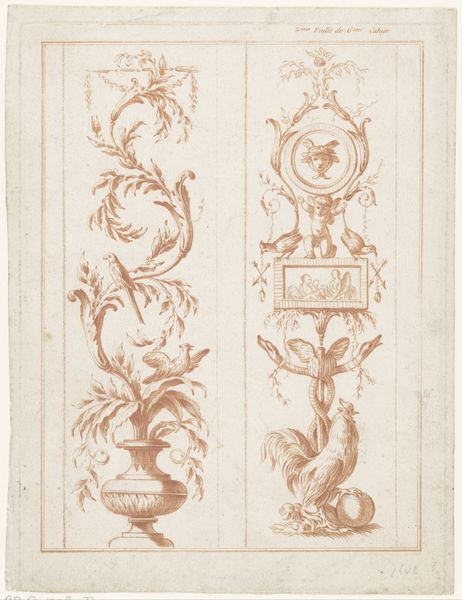 Curator: This sketch, dating from sometime between 1630 and 1672, is titled “Ontwerp voor een glasraam met blanco wapenschilden en putti,” or, “Design for a stained-glass window with blank coats of arms and putti” by Pieter Jansz. Editor: It strikes me as airy and ornate. There’s so much detail crammed in, but the use of line gives it a certain delicacy. Almost ephemeral, like looking at a blueprint for a dream. Curator: Exactly! You know, seeing these designs, you almost get the sense of stepping into the workshop, smelling the ink, feeling the grain of the paper. It’s a design, and thus inherently practical, but notice how Pieter utilizes the etches, inks, and various pens. The drawing itself seems less a means to an end, but rather, a complete act of material exploration in its own right. Editor: Yes, this isn’t just about drafting a window; it’s about experimenting with the line, the shading, seeing what kind of visual magic you can conjure up with a simple quill. I’m drawn to the idea of those blank shields, ready to be filled with stories, histories. Makes me think about who was commissioning this work, and the skilled labor required. Who were they hoping to impress? What narrative did they plan to impose through those carefully crafted lines? Curator: It makes me wonder too—it feels as if this design is not only forward-looking but nostalgic. It is embracing the exuberance of the Baroque but in this liminal space: a ghost of its former self waiting to become fully realized. What will it become, I wonder? Who will this touch? And how can something so calculated still have an echo of the divine, and that which connects us to one another? Editor: Well, the blankness offers potential – like a theater set waiting for the players to arrive. Perhaps that openness speaks to the possibility of a future still unwritten, full of promise—much like Jansz’s ink itself, which preserves potential on the page itself! Curator: Yes, and there is something fundamentally beautiful about that hope, suspended in time by the artist’s skill and vision. Editor: Indeed! Looking at it, I can appreciate both the final effect that was intended and its artistic labor as a testament to a very material, temporal ambition.