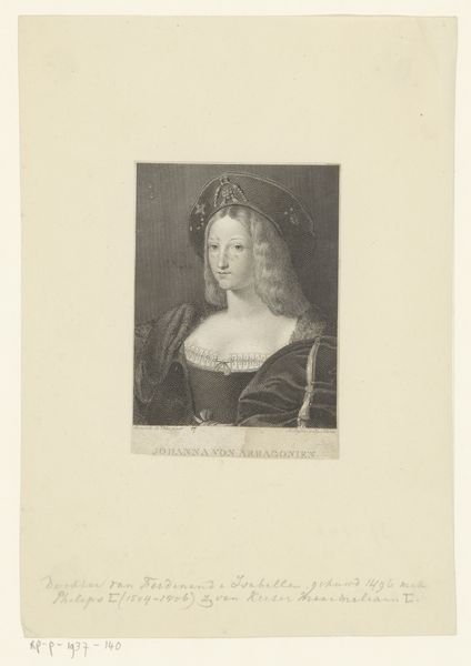 Editor: This is Achille Désiré Lefévre’s portrait of Jeanne d'Aragon. The print really captures her elegant composure. What can you tell me about the depiction of women in art during this time? Curator: This image presents an opportunity to examine the historical expectations placed upon women of nobility. Consider how her clothing and adornments served as signifiers of her status, reinforcing societal hierarchies. How does this portrayal contribute to our understanding of female power, or the lack thereof, in the Renaissance? Editor: That makes me think about the limitations placed on women. Thanks for the context. Curator: Absolutely. Considering these power dynamics helps us critically engage with art history.