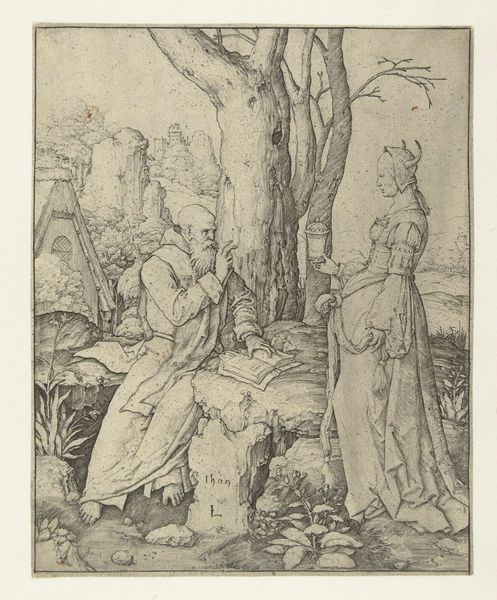 Lucas van Leyden created "The Temptation of St. Anthony" using engraving, a medium allowing for incredibly fine, detailed lines. The composition presents a stark contrast: St. Anthony, engrossed in his book, is disturbed by a female figure offering him a chalice. Van Leyden masterfully uses line to create texture and depth, drawing our eye from the foreground figures to the landscape behind. Notice how the lines vary in thickness and direction to render the rough bark of the tree. The figure of St. Anthony is slumped and turned inward while the female figure is erect, facing outward, and adorned with horns. Consider the dichotomy between worldly temptation and spiritual devotion. The tension within the artwork is not merely narrative; it is embedded in the formal structure, inviting contemplation about the interplay between desire and piety. The engraving is not just a representation but an active space where ideas about morality and human nature are negotiated.