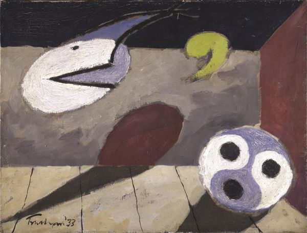 Curator: Arshile Gorky’s “Image in Khorkom,” an oil painting from 1936, is currently held in a private collection. It’s a fascinating piece that blends organic shapes with figuration and abstraction, placing it firmly within the realm of Surrealism. What’s your immediate reaction to this one? Editor: Whoa, it's like stepping into someone else's dream...or maybe their subconscious? There's something really unnerving, but also beautiful, in how these shapes almost, but don't quite, resolve into something recognizable. Like faces or figures... it is oddly sexy too? Curator: Exactly! Gorky, who was deeply affected by his experiences as an Armenian immigrant, often explored themes of memory and displacement. This piece, created around the time he was exploring his Armenian heritage, suggests a complex intertwining of identity and trauma. What we read as "unresolved" may in fact reflect the historical and cultural fragmentation Gorky's identity embodies. Editor: I can see that. The forms really do twist and turn back on themselves. It's hard to get a grasp on anything solid. What is compelling about this lack of clarity is that there is something I feel I'm SUPPOSED to recognize. My body has a reaction to the biomorphic forms as they hint towards my own biology... Gorky certainly knew his body! Curator: That feeling of unease and longing you're describing can be tied to the broader political landscape of the 1930s, too. Think about the rise of fascism and the looming threat of war. Surrealism as a movement often responded to social upheaval through such visceral, emotional imagery, critiquing rationalism and societal norms. Editor: Yes! You nailed it! It's like all these feelings, fears, bodily experiences swirling around. He's hitting the raw, almost pre-verbal nerves... it is all quite carnal too! Like the primordial soup of life or art itself. It really pulls something out of you, doesn’t it? It wants to communicate at all costs. Curator: It certainly invites a deeper exploration of what it means to be human and, crucially, the narratives we use to define ourselves amidst instability. Editor: Absolutely. "Image in Khorkom" does that, and in ways words just can't grasp. A truly beautiful wrestling match with reality and maybe our nightmares.