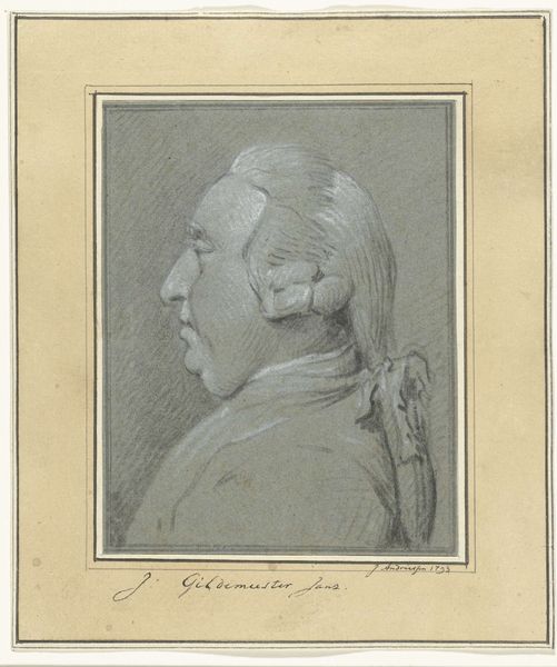 Curator: Let’s consider this captivating profile portrait, titled "Profielportret van een oudere man met pruik", housed right here at the Rijksmuseum. While its precise creation date is open to some debate, it’s believed to originate somewhere between 1750 and 1840, conceived by the skilled hand of Augustin de Saint-Aubin. Editor: Ah, yes, this older gentleman! I’m immediately struck by a certain fragility, or perhaps vulnerability in this image. The delicate pencil strokes...it’s as if he's almost fading away. There's a whisper of melancholy, wouldn't you agree? Curator: I appreciate that perspective. From my understanding, this work embodies certain aspects of Neoclassical art, where there was indeed this focus on idealism, though tempered here by, as you note, the medium's subtlety. And of course, it places the figure squarely within the aesthetic conventions of the period – the powdered wig is a distinct marker of social status, for example. Editor: Of course, the wig screams of that era. Yet, despite its function as social signaling, I am curious about what kind of expression the artist has successfully given the portrait. The subject has a straight posture, and slightly frowning brow, like he disapproves of something or maybe somebody. Curator: Exactly! While it is "just a drawing", these sketches offered insight into a personage beyond courtly artifice. The materiality contributes enormously to this aim as well, as Saint-Aubin captures a psychological presence amidst his social position. Editor: The slight unevenness, that hazy line quality—it almost imbues the piece with a modern feel, or invites contemplation about what "real" is when looking at one's image, wouldn't you agree? A candid observation about aging that moves beyond pure flattery. It offers this…human connection. Curator: Ultimately, this unassuming portrait drawing opens dialogues about the period itself, about how individuals negotiate social roles, and about portraiture and the human presence it has come to represent. Editor: Agreed. Saint-Aubin may have just aimed for an efficient depiction, but he gave this man on paper something genuine and everlasting!