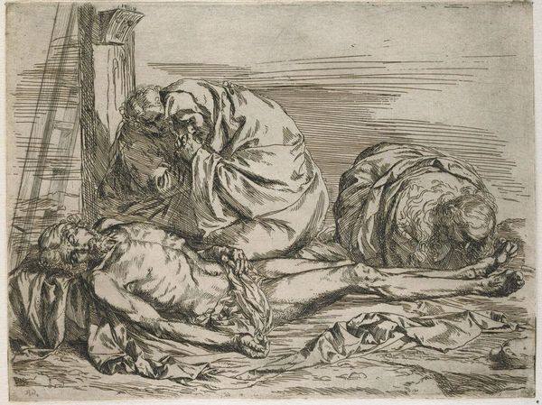 Art Historian: This delicate pen sketch is entitled "The Virgin, Saint John the Baptist, and Mary Magdalen weeping over Christ's dead body" by Jusepe de Ribera, dating back to 1624. It resides at the Metropolitan Museum of Art. Curator: Wow, the immediate impression is one of intense grief and vulnerability, but rendered with such fragile lines. It almost looks like an unfinished engraving. It's surprising the artist opted for a pen and ink rather than richer material for this potent image. Art Historian: Indeed. The choice of ink is poignant, a seemingly simple material to depict a profoundly complex and symbolic moment. We see three figures, each representing core facets of sorrow— the Virgin Mother's unbearable loss, Mary Magdalene's repentance, and John the Baptist's prophetic mourning. Curator: I am more concerned with how this drawing served his larger studio practice. Do we know if this preliminary study informed a more elaborate altarpiece, perhaps exploring various figural arrangements and the handling of drapery, to determine its translation into painting? Art Historian: It could very well have been. Ribera was deeply embedded in the Neapolitan devotion and response to religious works like these would dictate future iterations. Think about the raw emotion of loss, passed down through centuries of visual representation, almost like a roadmap for conveying faith through artistry. Curator: But doesn’t focusing solely on the spiritual meaning erase the skill required to translate human suffering onto paper? I am keen to know who prepared the paper. I am intrigued by what particular pen and ink Ribera selected to execute the scene. There are many hands involved to complete even such intimate art. Art Historian: I don't deny the labor, I simply appreciate that those technical means support the narrative: of lament, sacred loss, and devotion. Ribera captures grief with an immediacy that still resonates today, linking us to shared experiences through these carefully chosen visual tropes. Curator: I concede. The artist's material decisions support the emotional tenor, allowing access to universal feelings regarding mortality. In thinking of its execution I see those very real sentiments come alive. Art Historian: Precisely, even the subtlest of visual forms holds such a potent and lasting imprint of feeling.