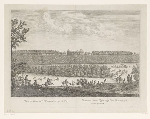 Editor: We're looking at Giovanni Francesco Venturini's print, "Fountain in the gardens of the Villa d'Este in Tivoli," created sometime between 1653 and 1691. It's an engraving, and I'm struck by the rigidity of the composition, almost a stage set. What elements stand out to you in this piece? Curator: The orthogonals certainly define the space. Notice how Venturini orchestrates a rigorous perspectival system that channels our vision. The strong lines converge towards a vanishing point, a key strategy in Baroque compositions which favored grandeur. And consider the modulation of light and shadow—how it delineates the forms and creates depth, primarily through the meticulous, systematic hatching. Editor: It's interesting that you call out the light and shadow. Given it's an engraving, do you see specific material effects that support this visual strategy? Curator: Precisely. Look closely at the varying density of the etched lines; they establish value. Where lines are packed more densely, there's a darker tone, simulating shadows and suggesting volume. And consider the textural implications - the foliage of the hedges has been carefully structured. Note how it creates an illusion of depth. Do you perceive a specific organizing structural element? Editor: Well, there's the repetition of the fountains, for one. The repeating elements create rhythm and unity within the rigidly structured scene. Curator: An astute observation. That rhythmic cadence leads our eye and the composition holds together in an orderly whole. Consider that the Baroque aims for drama through carefully calculated control. It's through understanding these intrinsic visual elements that we access and interpret the artist's intention and historical place. Editor: I see it now. Analyzing those formal choices definitely sheds light on the purpose and intention behind the overall feeling. Thank you for clarifying Venturini’s design.