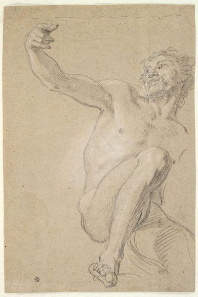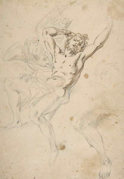 Editor: This is Jacopo Tintoretto's drawing, "Samson and the Philistine," done with black chalk on blue paper. The muscular figures convey so much energy. What can you tell me about it? Curator: Well, consider the materials. Tintoretto chose chalk, a readily available material, not precious pigments, focusing on the physical act of drawing. Note the blue paper; it wasn't mere backing, but a deliberate choice affecting the tonality. It raises questions about the economies of art making in the Venetian Renaissance. Editor: That makes sense. It is about more than just the Biblical subject matter. Curator: Precisely. The drawing becomes about labor, the quickness of execution, and perhaps, the very *value* we place on a "sketch" versus a finished painting. It's a window into the workshop. Editor: Thinking about the process really changes how I see it. Thanks! Curator: Absolutely. Understanding the materials brings us closer to the artist's hand and the cultural context of creation.