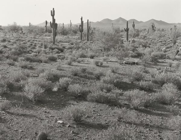 Curator: Robert Adams’ 1977 photograph, "North Table Mountain, Jefferson County, Colorado," presents us with a seemingly simple, yet structurally complex, landscape. Editor: I'll say. Bleak is the first word that springs to mind, like the last scene in some post-apocalyptic Western. It's…desolate. Curator: The starkness certainly speaks. Observe how Adams meticulously frames the composition. The subdued palette accentuates the lines and forms: the horizontal emphasis of the plains meeting the rounded mass of the table mountain, bisected vertically by the stark fence posts. Editor: Those "fence posts"…they are strange. They rise so randomly out of the landscape. Natural, or humanmade? They add to the slightly unsettling atmosphere, I think. They’re like musical notations—on some silent, haunting stave. Curator: Interesting metaphor. These linear intrusions, punctuating the organic scene, establish a critical tension. They underscore themes pervasive in Adams' work: the encroachment of man on the natural world, and the elegiac beauty within that alteration. Note the subtleties of light and shadow across the scene; the careful rendering of depth. Editor: Yes, but look, the emotional register is all wrong for ‘elegiac.’ I agree there’s beauty here, of a kind. But its muted tones are drained. It's not so much about what man *adds*, but about what he has, in a deeper sense, already taken away. The sense of infinite expansion – flattened. Curator: One might argue that this flattening itself embodies a type of sublime, capturing both scale and limit…Adams isn’t simply photographing a landscape; he’s critiquing our very perception of it. Editor: Precisely! But if the sublime registers *at all* it registers on its way to its vanishing point. This feels utterly unsentimental, almost aggressively so. An anti-pastoral. Curator: I find myself reconsidering its mood given our conversation. A successful work continues to challenge the viewer long after their first impression. Editor: Agreed. A powerful silence permeates the frame. Makes one think about perspective—both the photograph’s, and our own— in a whole new light. Or lack thereof, given this grayscale vista!