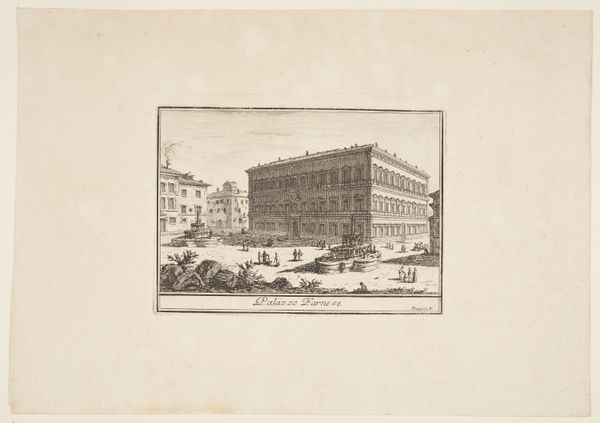 Curator: Before us is a drawing, printed with etching and engraving techniques, of the Galeries Royales Saint-Hubert in Brussels. The work, titled "Gezicht op de koninklijke Sint-Hubertusgalerijen te Brussel," likely created between 1834 and 1862, comes from the hand of Henri Borremans. Editor: My first thought? The overall feeling is delicate, almost ghostly. You have these meticulously rendered buildings but softened by a very subtle line work, it's like a memory rather than a statement. Curator: Indeed. The artist, Borremans, masterfully employs line work typical of Romanticism, a movement often reflecting on history. Consider the galleries themselves— symbols of modernity. Editor: Exactly. The galleries become a symbol of progress, capturing the collective desires and aspirations of the era, which adds this complex dimension. You see all these folks milling around in what looks to me like a social and architectural daydream. Curator: Yes, we witness how civic spaces become cultural canvases where people act, connect, and shape the shared narratives and historical record of their cities, with grand galleries as prominent players. But let's look closer: Notice how the people are mere silhouettes; almost spectral forms which gives an ethereal quality to their existence. The galleries take prominence. Editor: It's interesting how, although populated, there is still an echoing emptiness to the whole piece. Borremans suggests, or perhaps predicts, the isolating aspect that exists alongside the potential that these spaces hold, right? It's gorgeous, slightly sad...in a good way. Curator: Absolutely. The emptiness within that vibrant gathering is indeed there for consideration. The weight of time on civic aspirations? What this image will carry, forward? These open doors into this place can trigger the start of an important introspective moment. Editor: Yeah, a tangible expression of hopes that are somehow faded already in this rendition. Still worth aspiring to I reckon, after all. Curator: Indeed, a dance between aspiration and reflection, captured so delicately in this glimpse of 19th-century Brussels. Editor: Leaving us perhaps to wonder, what stories will our spaces whisper tomorrow.