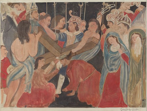 Curator: This tempera and watercolor drawing is William Herbert’s, “Station of the Cross No. 4: Jesus Meets His Mother,” from around 1936. It seems to capture the raw human emotion amid this moment. Editor: There's a weight to it, a somberness that the limited color palette really accentuates. What’s fascinating is the clear display of figuration throughout, giving it an almost comic strip quality despite the historical setting. Curator: Herbert uses the biblical narrative as a springboard to reflect on themes of injustice, grief, and power dynamics, issues sadly still so resonant today. It's interesting to me how Herbert positions Mary within this scene of suffering, the one place where female presence seems allowed. We often frame such scenes through a very masculine lens. Editor: Exactly! And looking at the medium itself - watercolor - feels important here. It’s immediate, almost like reportage. It creates a social immediacy and accessibility—not quite high art. Also, I notice this rough execution. It almost evokes murals—are we meant to see the human labor and skill, however limited, here? Curator: Precisely! These choices serve to democratize a very well-known religious scene. Editor: The cross looks so heavy! And yet here the act of image-making involves so many light strokes and a watery paint. Curator: Let's not ignore how the artist creates tension between faith and social consciousness. The artist doesn't portray it as a miraculous, almost ethereal vision, instead emphasizing the grounded, lived experience within this narrative. It acknowledges both its religious foundation and a radical reading of power. Editor: This pushes me to see beyond just the iconic story; it invites me to consider the material processes involved in the artmaking itself. The layering of watercolours, for example—you see these subtle details, how this texture makes this powerful commentary. Curator: Absolutely. By acknowledging these nuances, we can better grapple with themes of resistance, mourning, and the collective experience of trauma present throughout Herbert's work. Editor: Ultimately, focusing on technique opens an entryway into broader conversations. This image underscores the idea that the message resides not just in representation, but also within the materials themselves.
