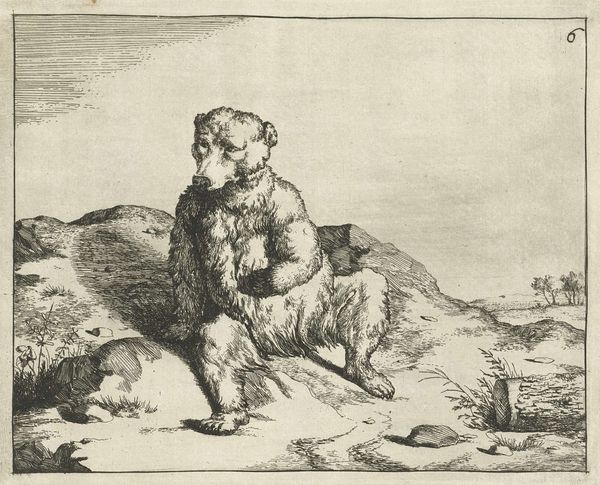 Marcus de Bye created this etching of a 'Lying Bear, from the Front, with Both Paws Around a Bowl' sometime in the 17th century. Notice how the stark contrast between the delicate lines and the blank space gives this piece an intriguing dynamic. The bear, rendered with dense, almost chaotic, lines, appears massive against the sparsely detailed landscape. De Bye’s technique invites us to consider the semiotics of animal representation. In this composition, the bear's posture, hunched over a bowl, transforms the wild animal into something domestic, almost human. The lines work to create texture and volume, suggesting the weight and presence of the bear’s body. Yet, the landscape remains minimal, almost an afterthought, which intensifies the focus on the bear itself. Consider how the artist uses line and form not just to depict, but to challenge our understanding of nature versus culture. It destabilizes the conventional, inviting us to decode the signs and meanings embedded within.